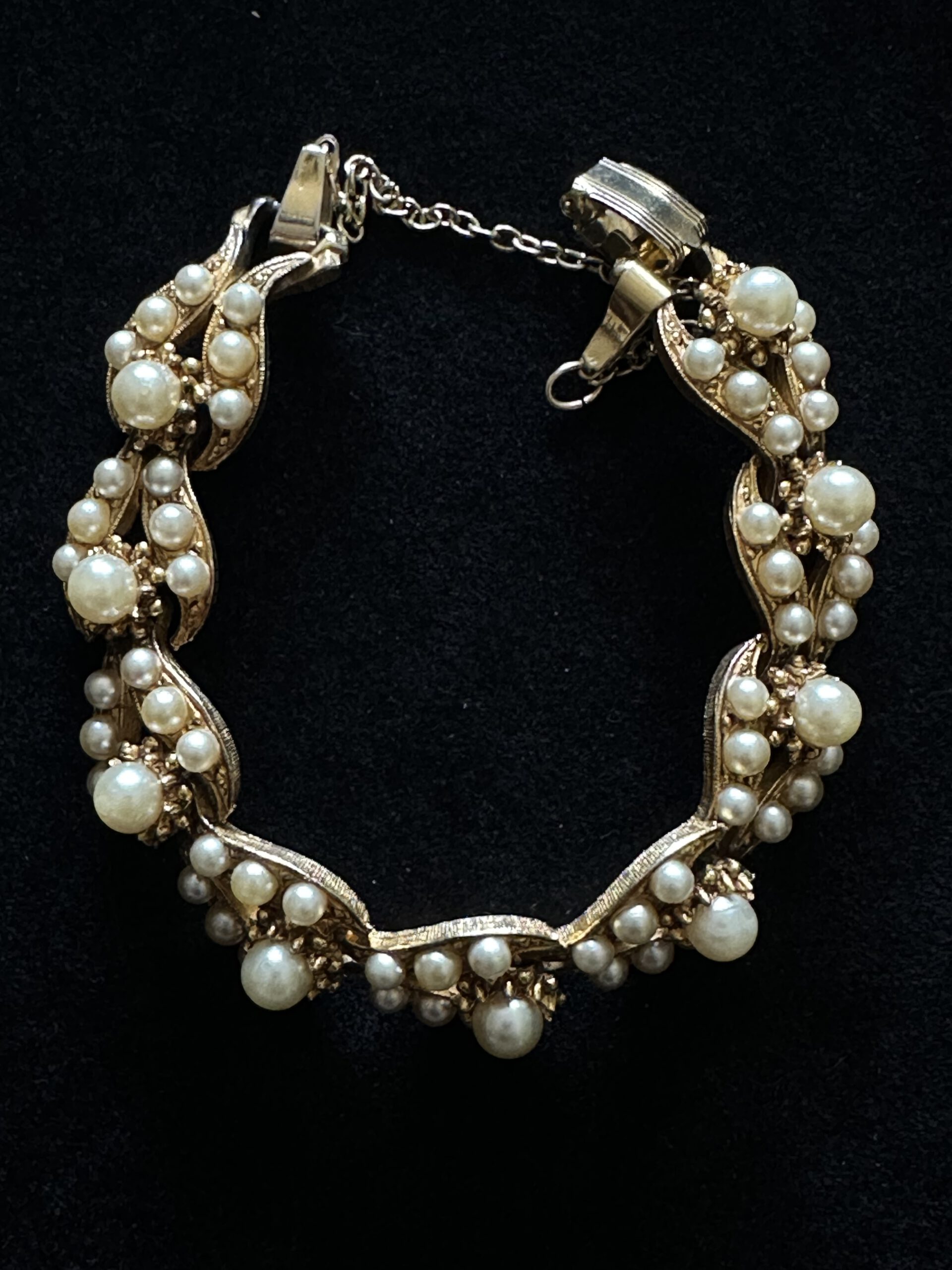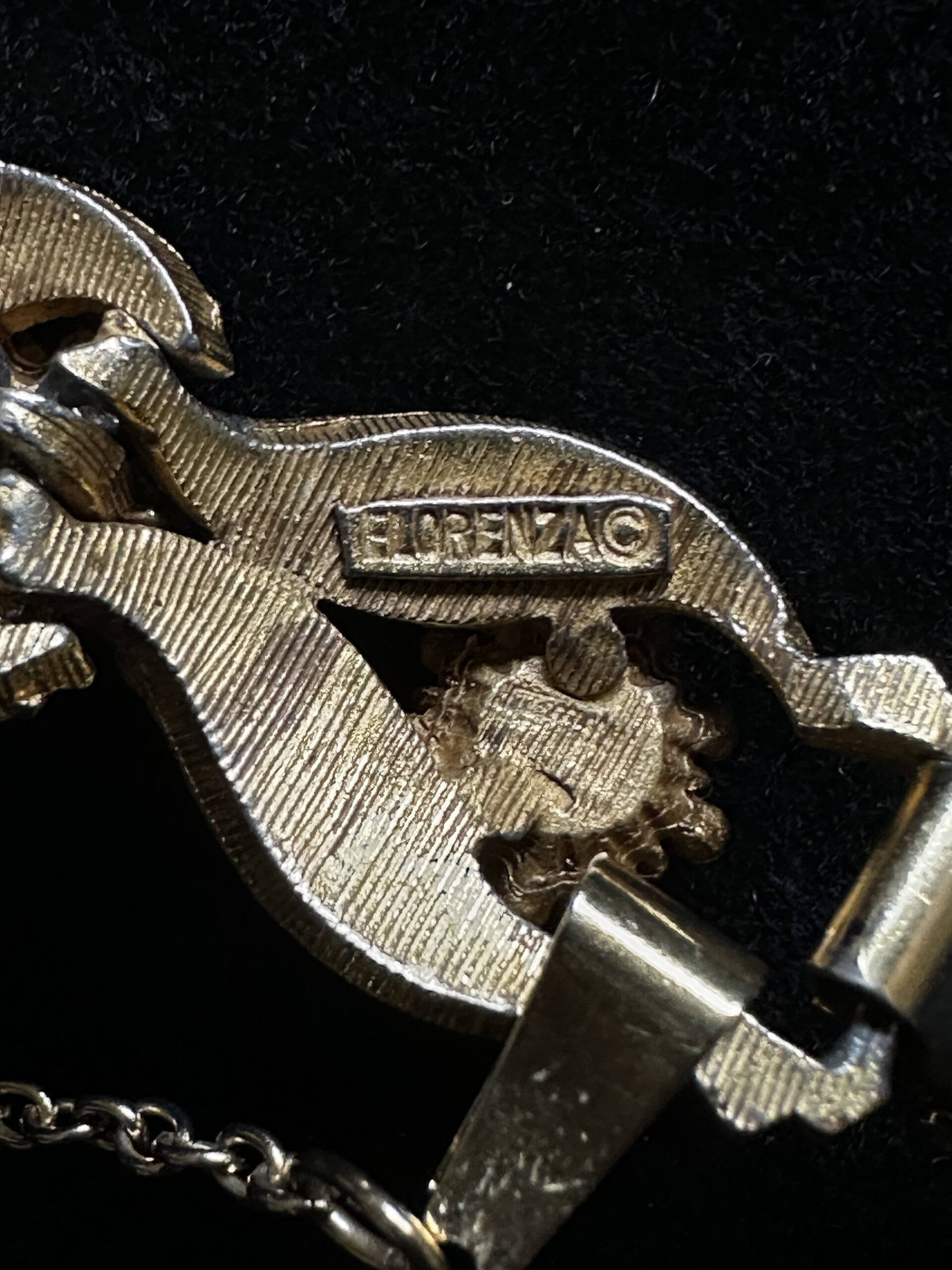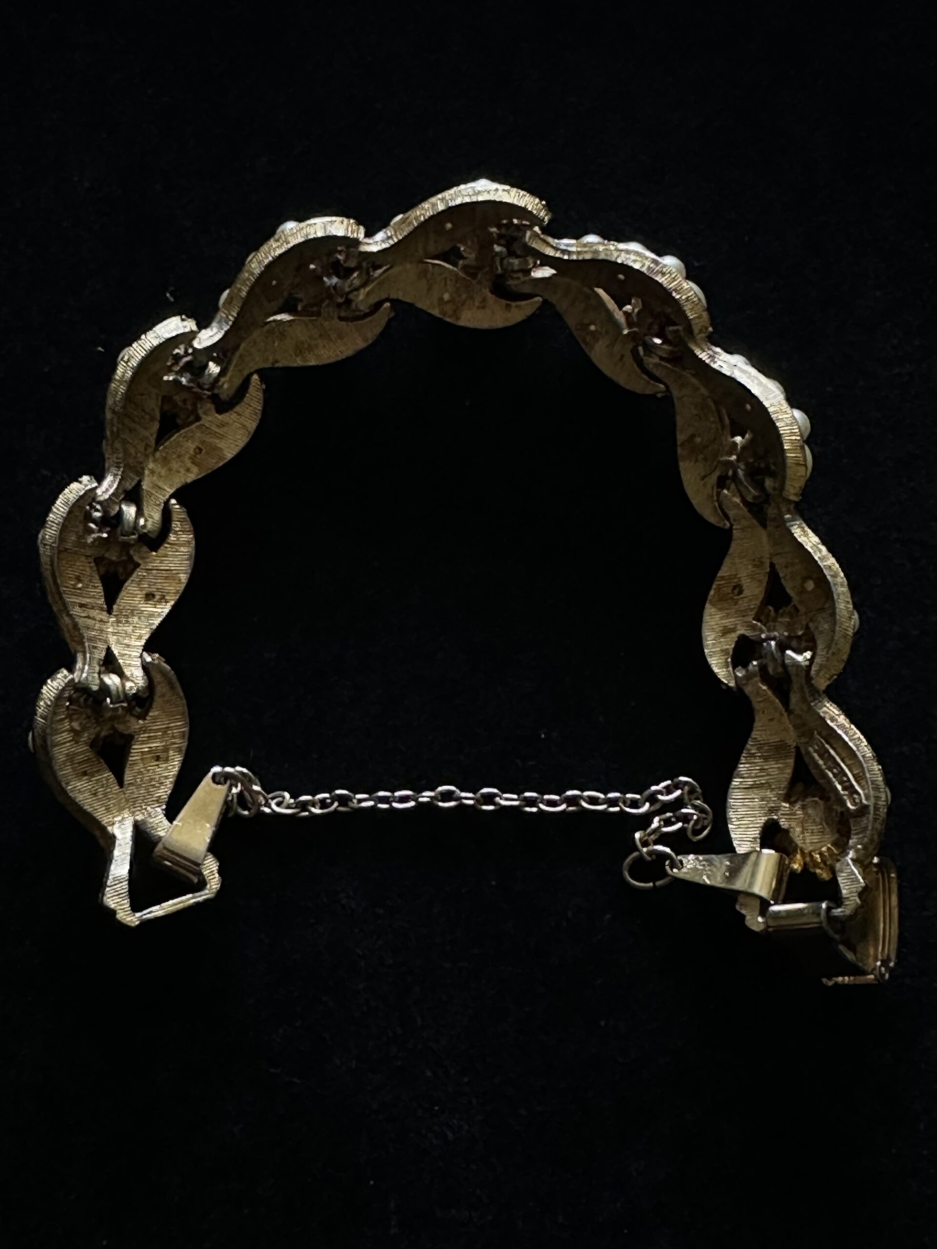 Dieses goldfarbene Vintage-Armband überzeugt durch seine harmonische, symmetrische Gestaltung und den feinen Besatz mit kleinen Perlen. Die dezente Eleganz wird durch die Signatur Florenza unterstrichen – ein Hinweis auf seine Herkunft und Qualität. Ein stilvolles Schmuckstück für Liebhaber*innen klassischer Vintage-Ästhetik.