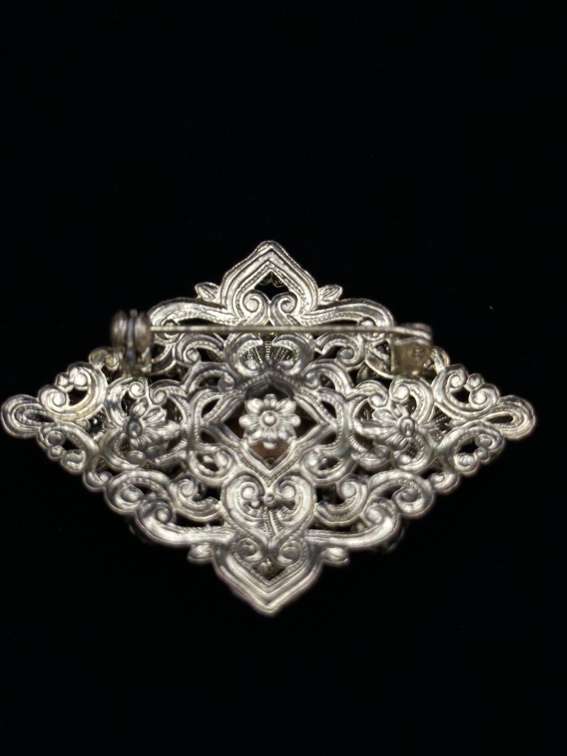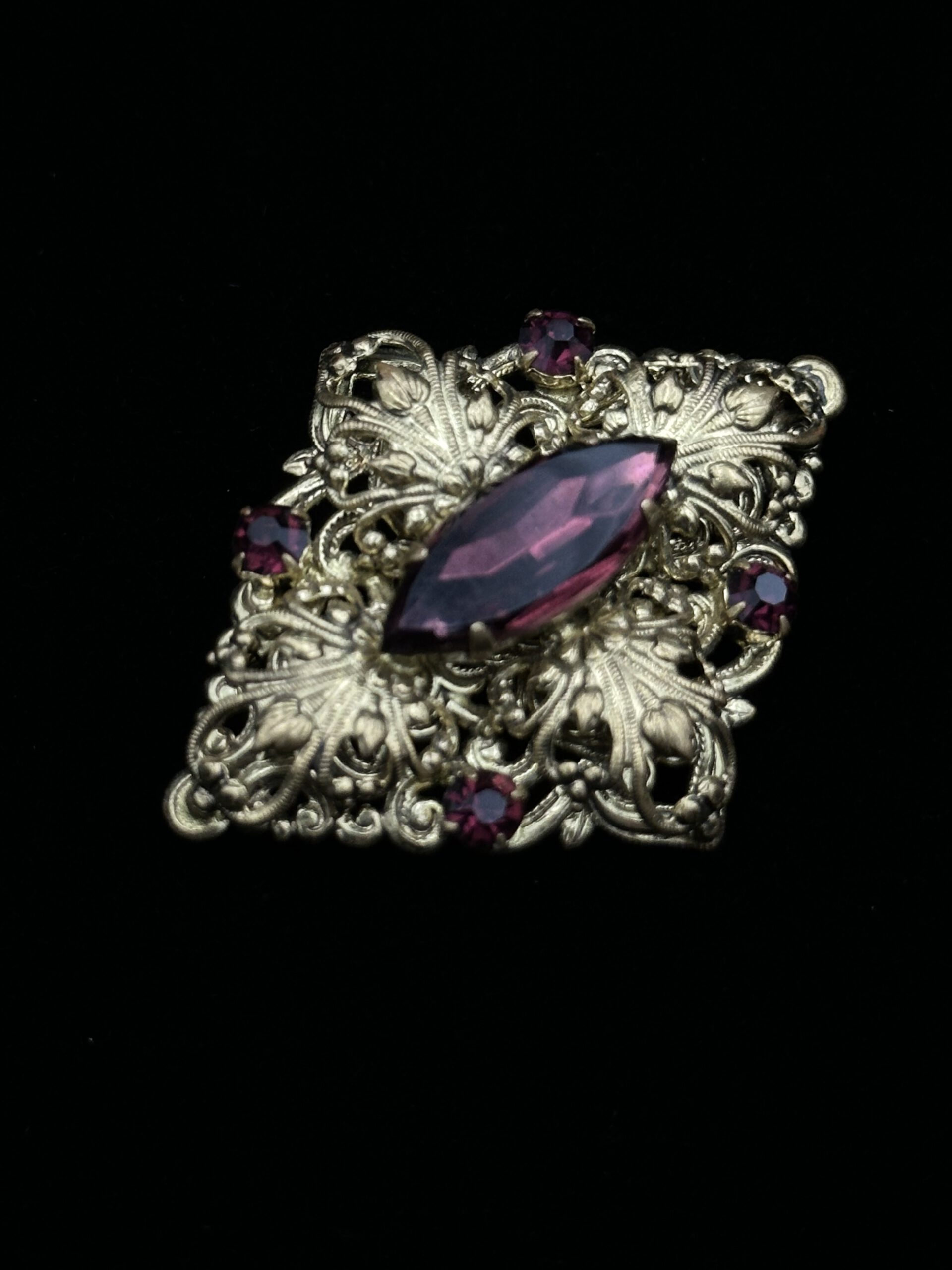 Diese elegante Vintage-Brosche erstrahlt in leuchtenden Lilatönen, eingefasst in filigrane Metallarbeit. Ein edles Schmuckstück, das Farbintensität und zeitlose Eleganz harmonisch vereint.