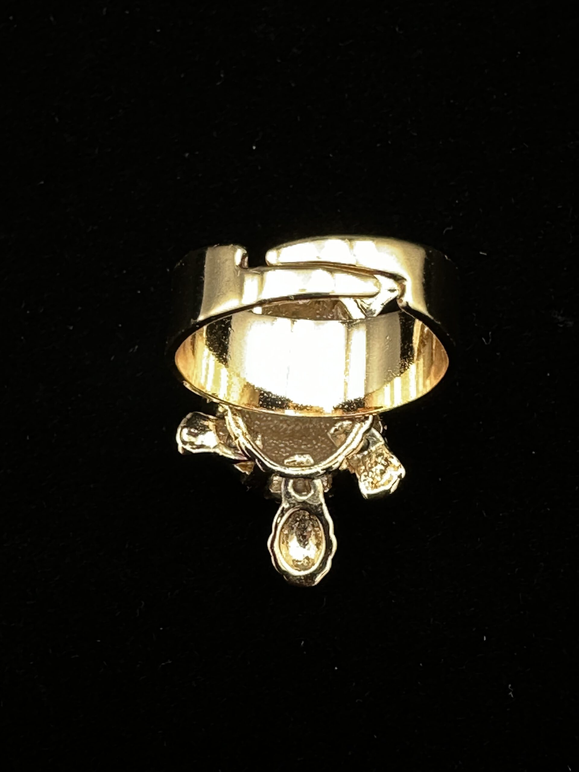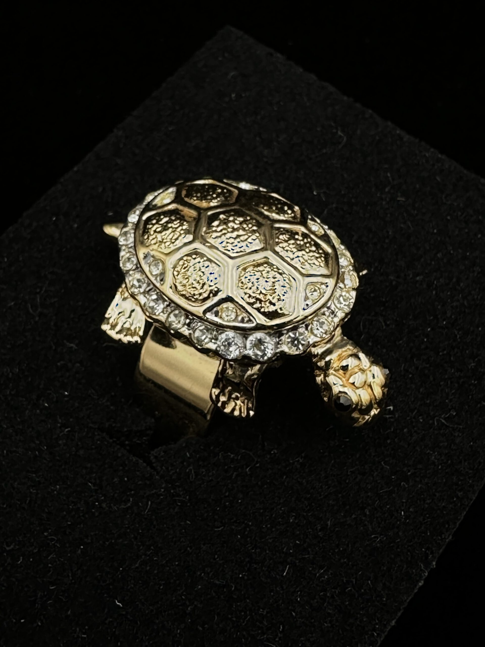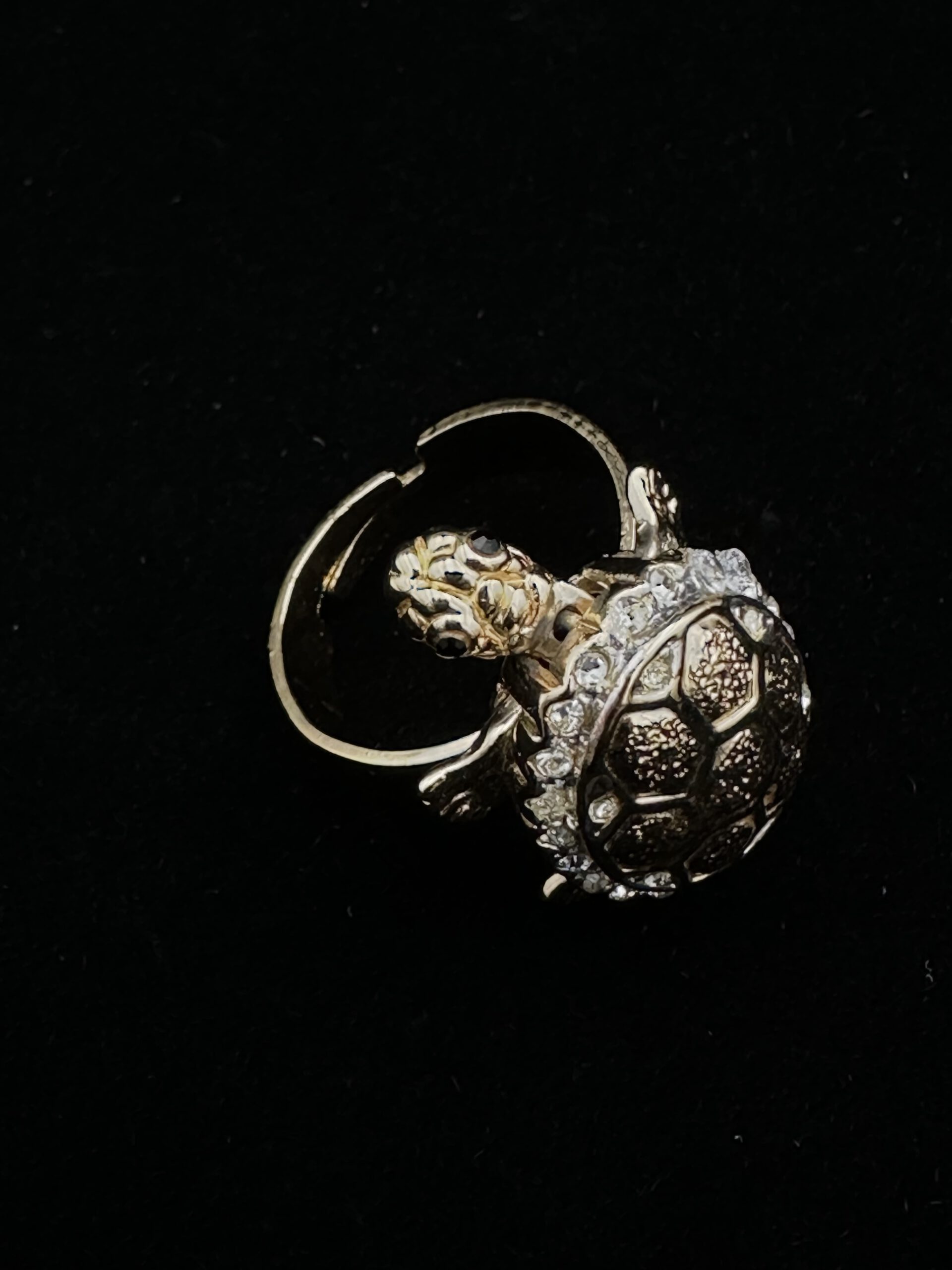 Ein verspieltes Schmuckstück mit außergewöhnlichem Charme: Dieser Vintage Ring zeigt eine kunstvoll gearbeitete Schildkröte, deren Kopf, Beine und Schwänzchen beweglich sind. Verziert mit funkelnden Strasssteinen wird er zum strahlenden Hingucker und verleiht jedem Look eine besondere, lebendige Note.