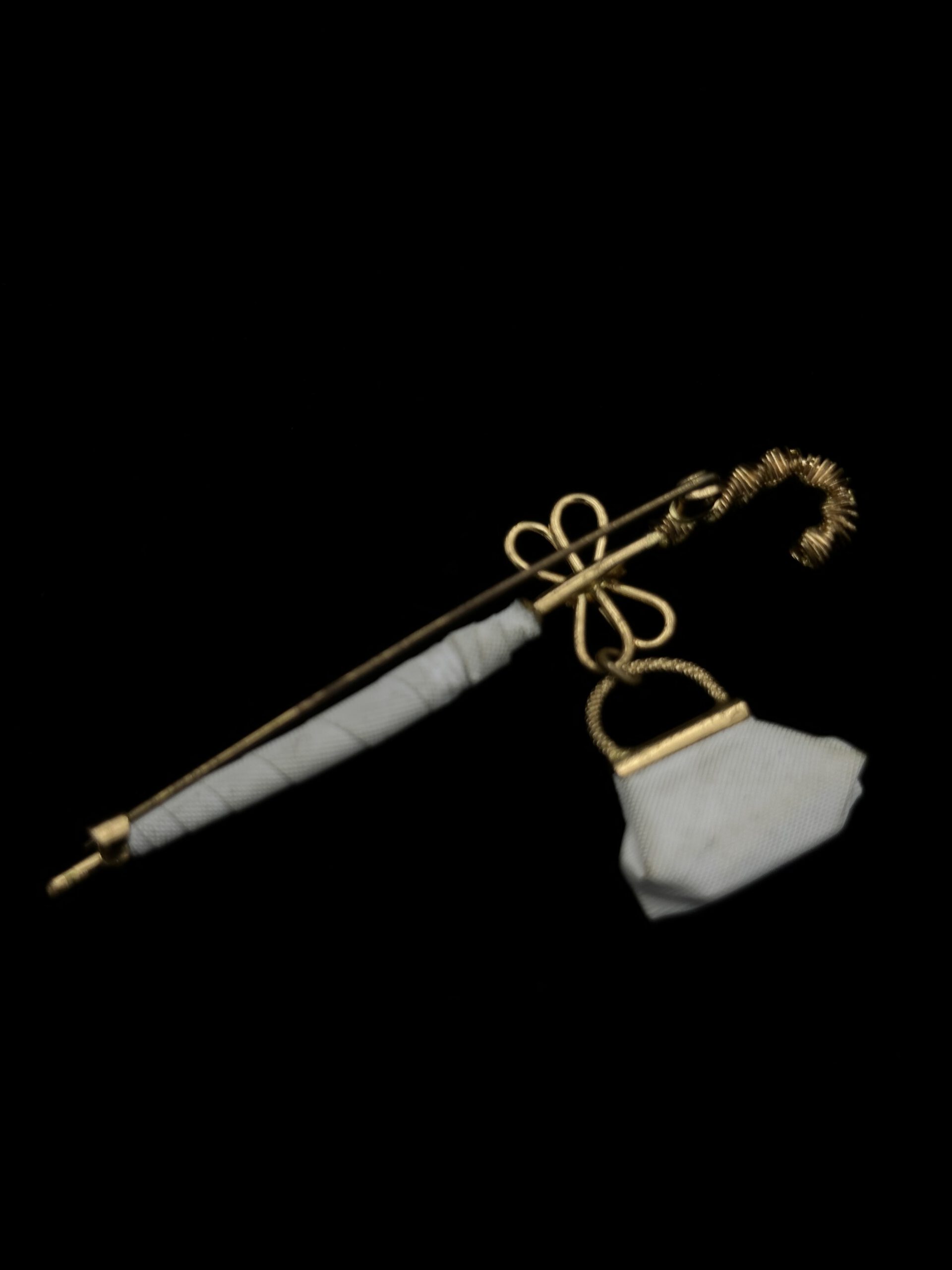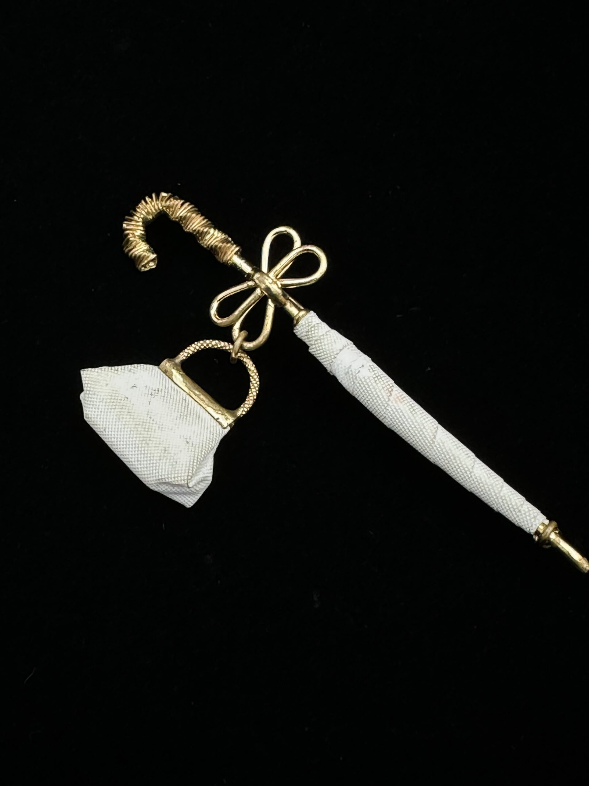 Ein seltenes Schmuckstück aus den 1950er Jahren: Diese detailreiche Brosche zeigt einen weißen Regenschirm, an dem eine kleine Tasche hängt. Eine echte Rarität mit zeitlosem Charme – perfekt für Liebhaberinnen besonderer Vintage-Accessoires.