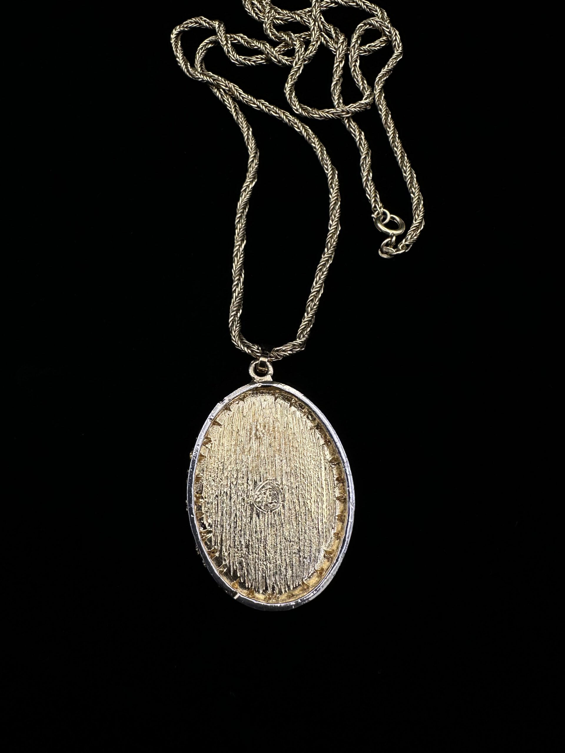 Elegante lange Kette in Goldoptik, verziert mit einem ovalen Anhänger, der mit funkelnden lilafarbenen Amethyststeinchen besetzt ist. Ein stilvolles Vintage-Accessoire mit feiner Farbakzentuierung.