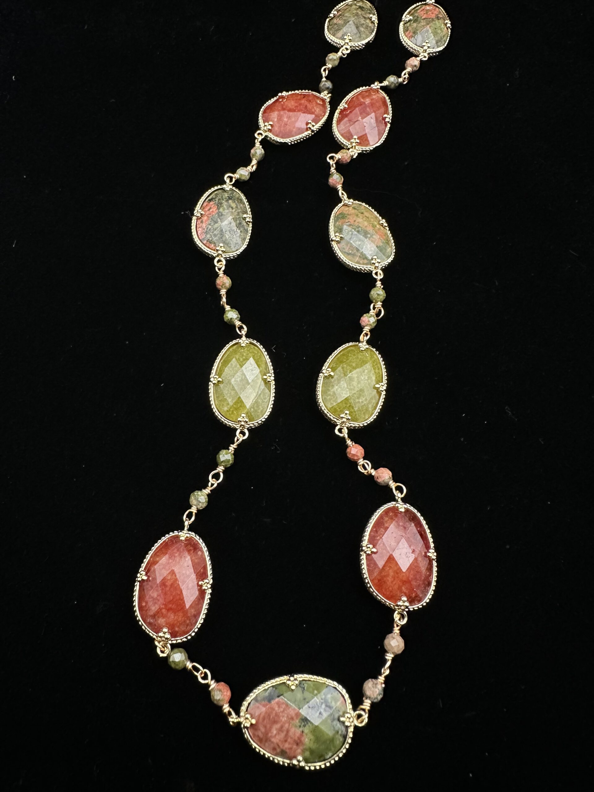 Diese einzigartige Kette vereint edle Agathe, leuchtende Türkise, mystische Amethyste und klaren Quarz zu einem harmonischen Farbspiel winterlicher Töne. Die facettenreichen Halbedelsteine bringen natürliche Eleganz und sanfte Farbakzente in jedes Outfit. Ein stilvolles, handgefertigtes Statement-Piece aus dem Grünen Salon – perfekt für alle, die zeitlose Schönheit mit saisonalem Flair lieben.