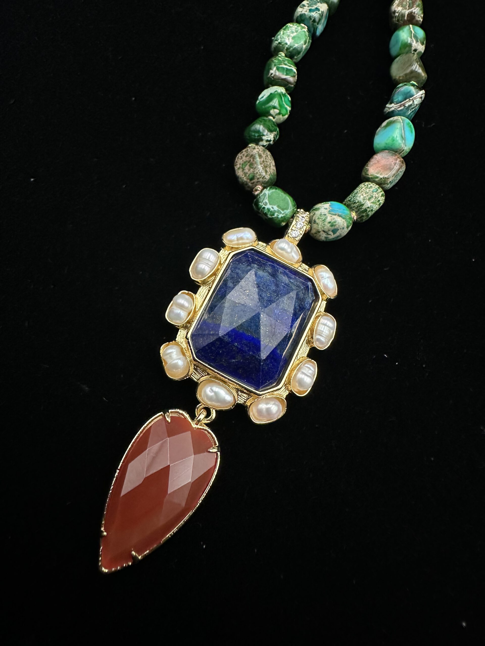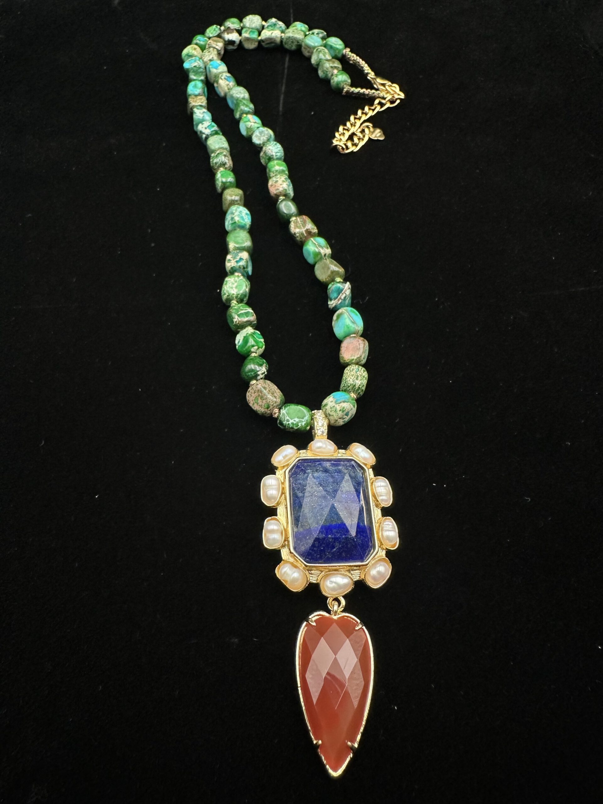 Diese edle Kette vereint die harmonische Schönheit von Agathe, leuchtenden Türkisen und Amethysten. Jeder Halbedelstein setzt seinen eigenen Farbakzent, während der dekorative Anhänger dem Schmuckstück eine besondere Präsenz verleiht. Ein stilvolles Unikat aus dem Grünen Salon – für alle, die Ausdruckskraft und natürliche Eleganz lieben.