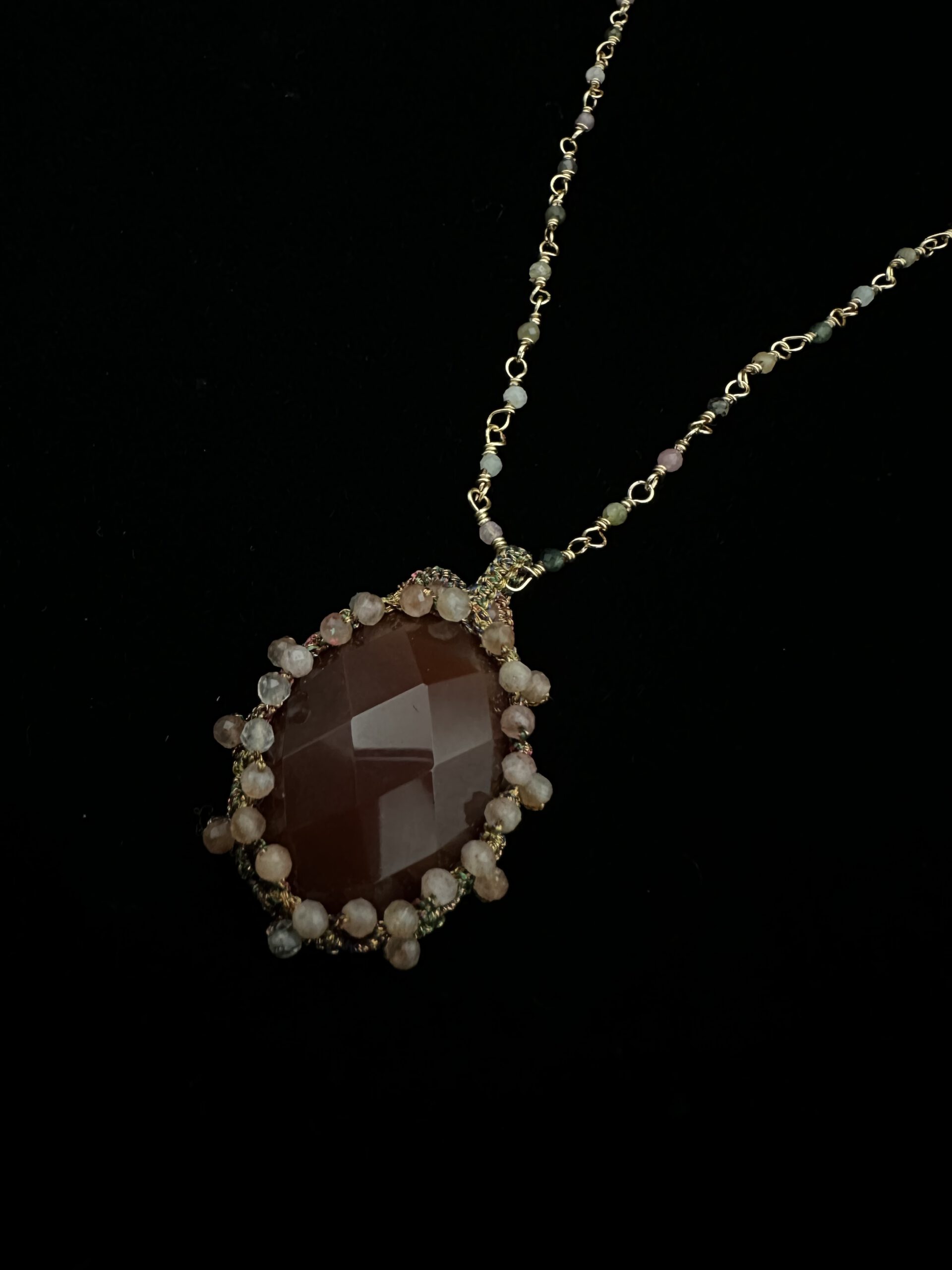 Diese feine, kurze Kette wird von einem Anhänger aus einem weinroten Halbedelsteinen geziert, dessen natürlicher Farb- und Lichtschimmer dieses Stück zu einem kleinen Unikat macht. Ein elegantes, leichtes Schmuckstück, das sanfte Akzente setzt und jedem Look eine natürliche, farbenreiche Note verleiht.