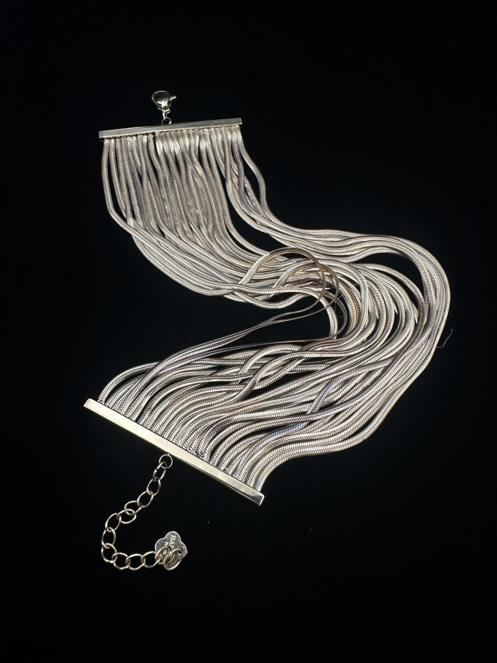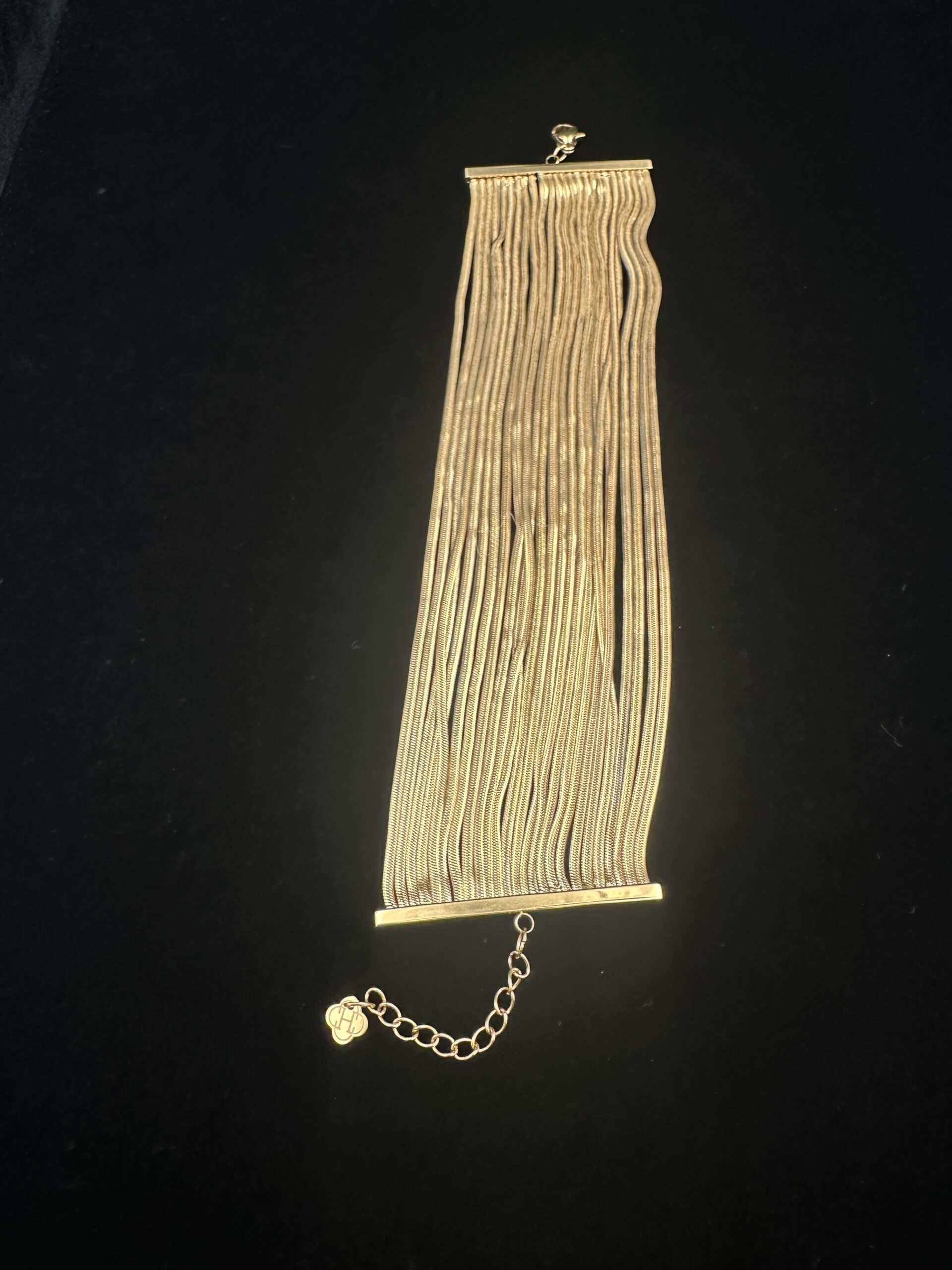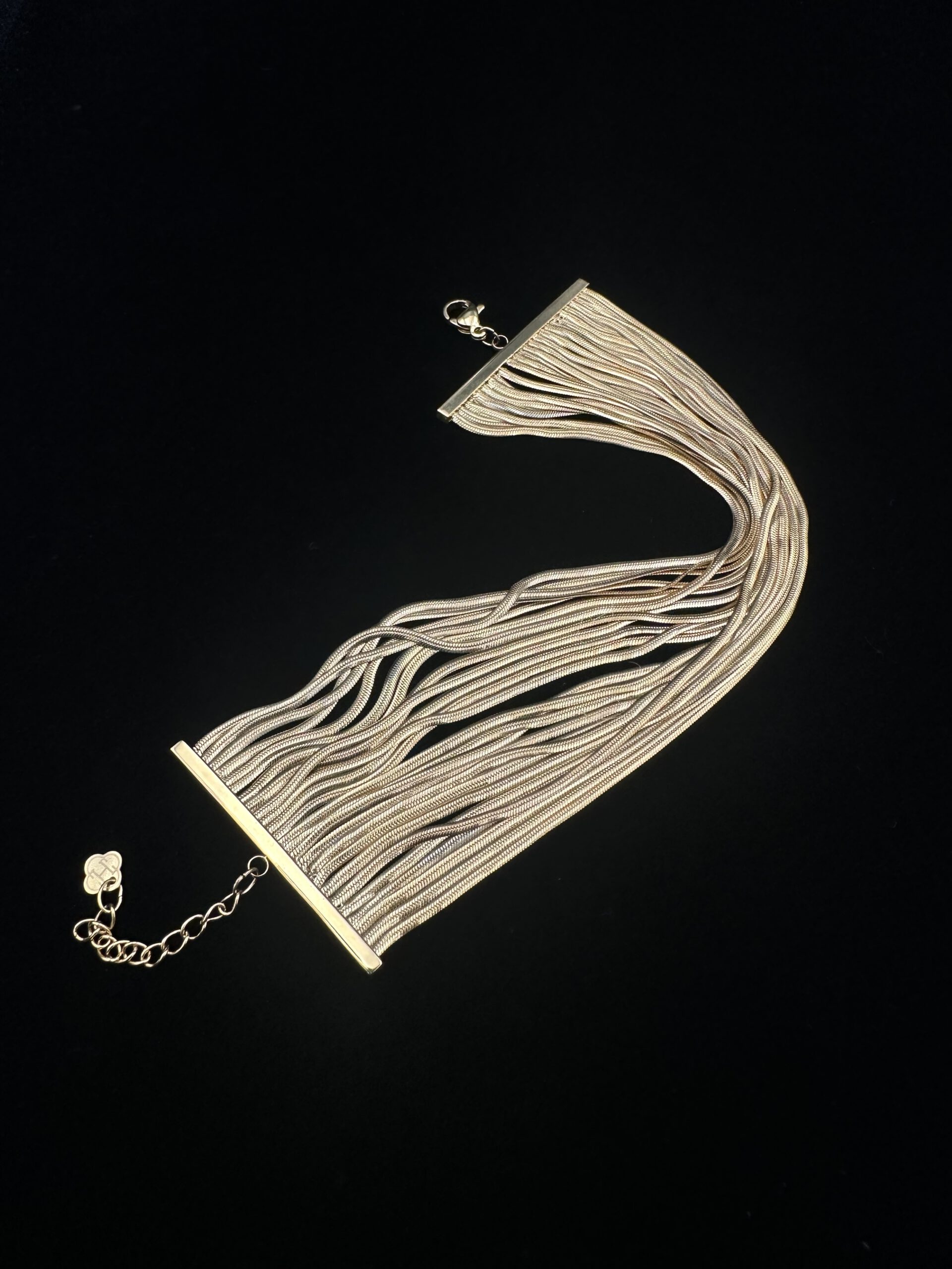Dieses elegante Modeschmuck-Armband besticht durch mehrere Bahnen zarter, goldfarbener Kettchen, die sich weich und harmonisch um das Handgelenk legen. Ein vielseitiges, stilvolles Accessoire, das jedem Look einen Hauch von Glanz und raffinierter Leichtigkeit verleiht.