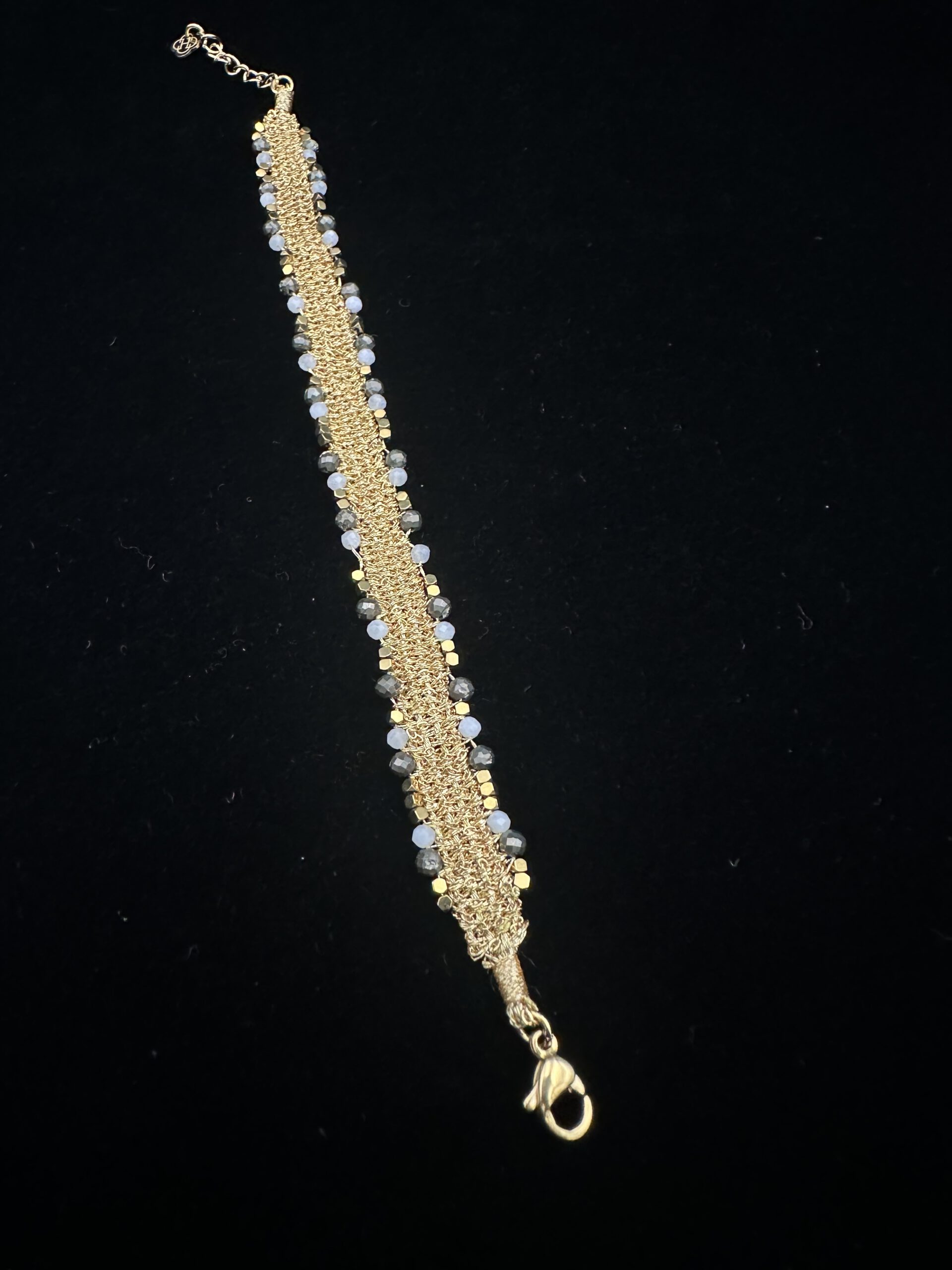 Dieses besondere Armband besticht durch seine fein gestrickte Optik in warmem Goldton, verziert mit zarten weißen und anthrafarbenen Perlenakzenten. Ein filigranes, verspieltes Schmuckstück, das jedem Look einen femininen und eleganten Touch verleiht.