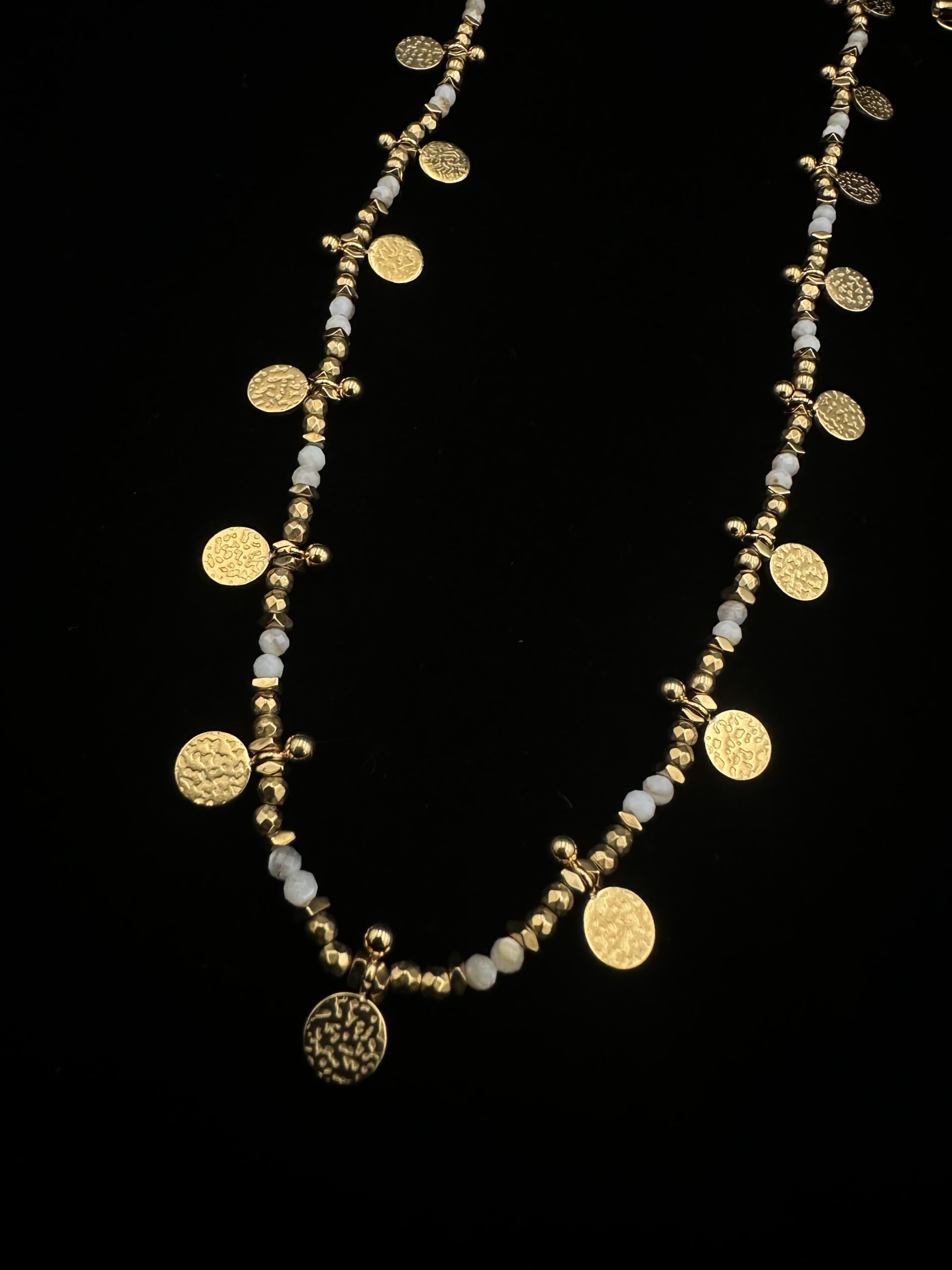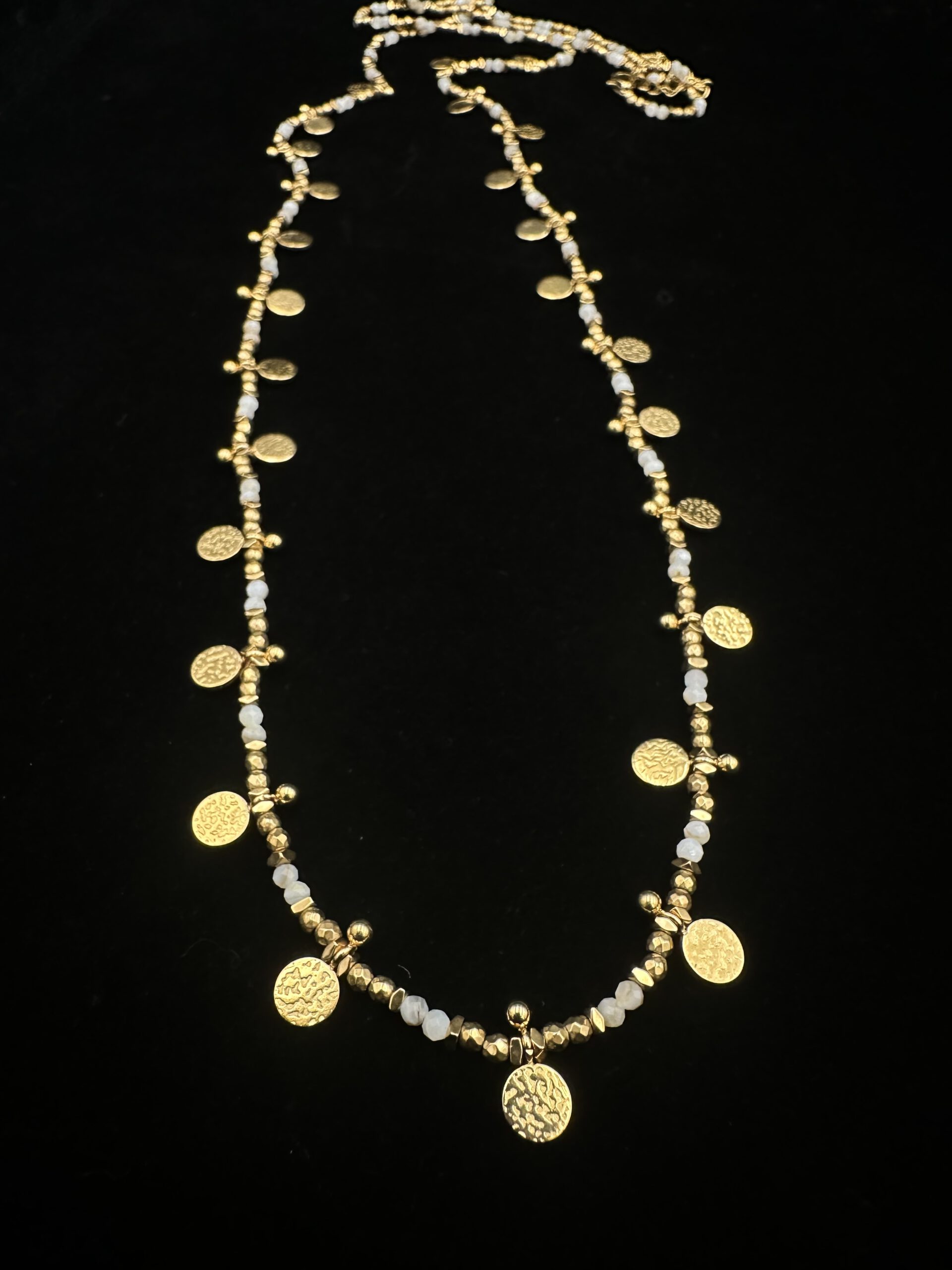 Diese edle, lange Kette aus zart schimmernden cremefarbenen Turmalinen wird von feinen goldfarbenen Plättchen begleitet. Das sanfte, natürliche Farbspiel und die leichte Bewegung der Plättchen verleihen ihr eine elegante, moderne Leichtigkeit – ein vielseitiges Schmuckstück für jeden Anlass.