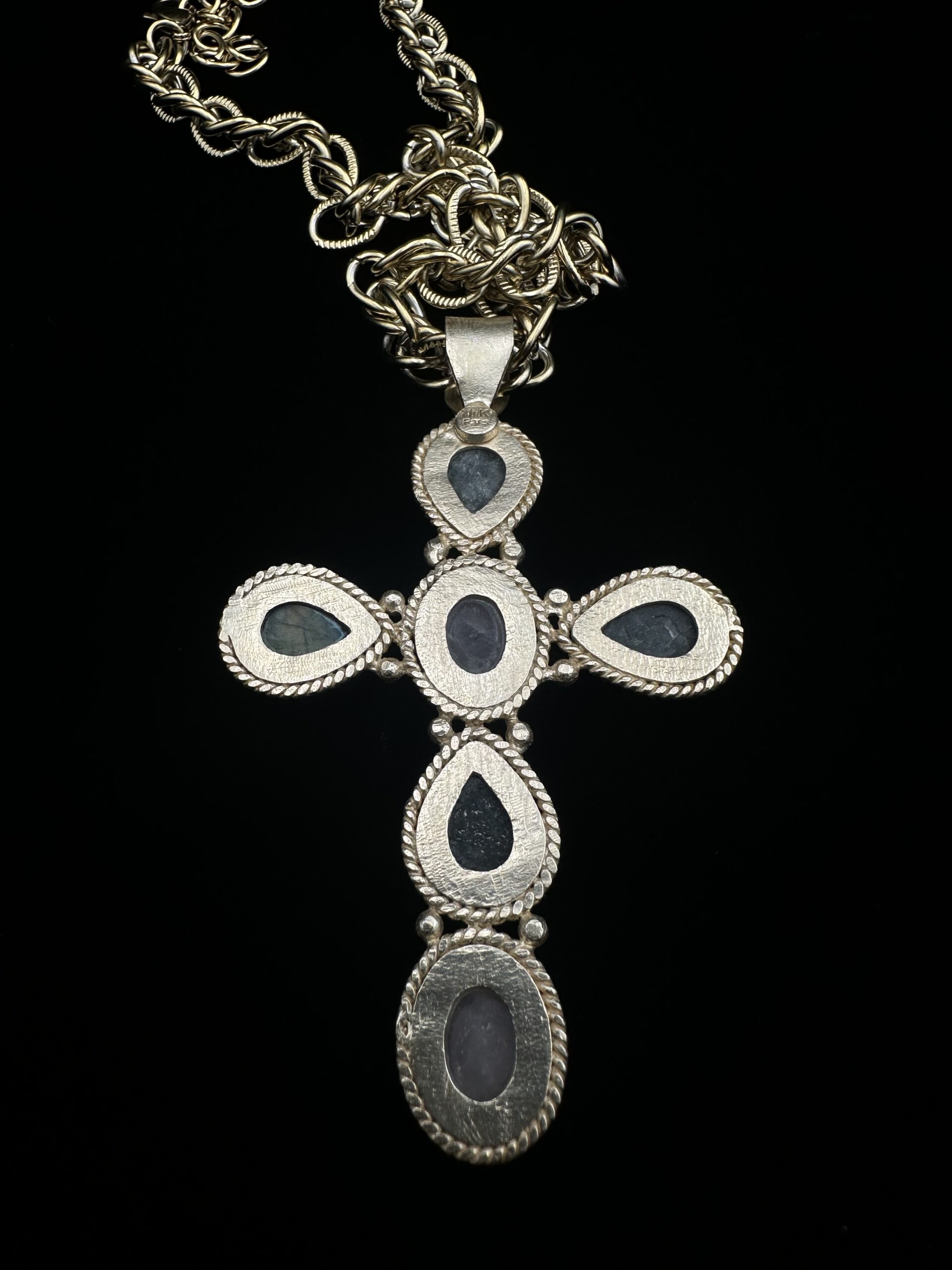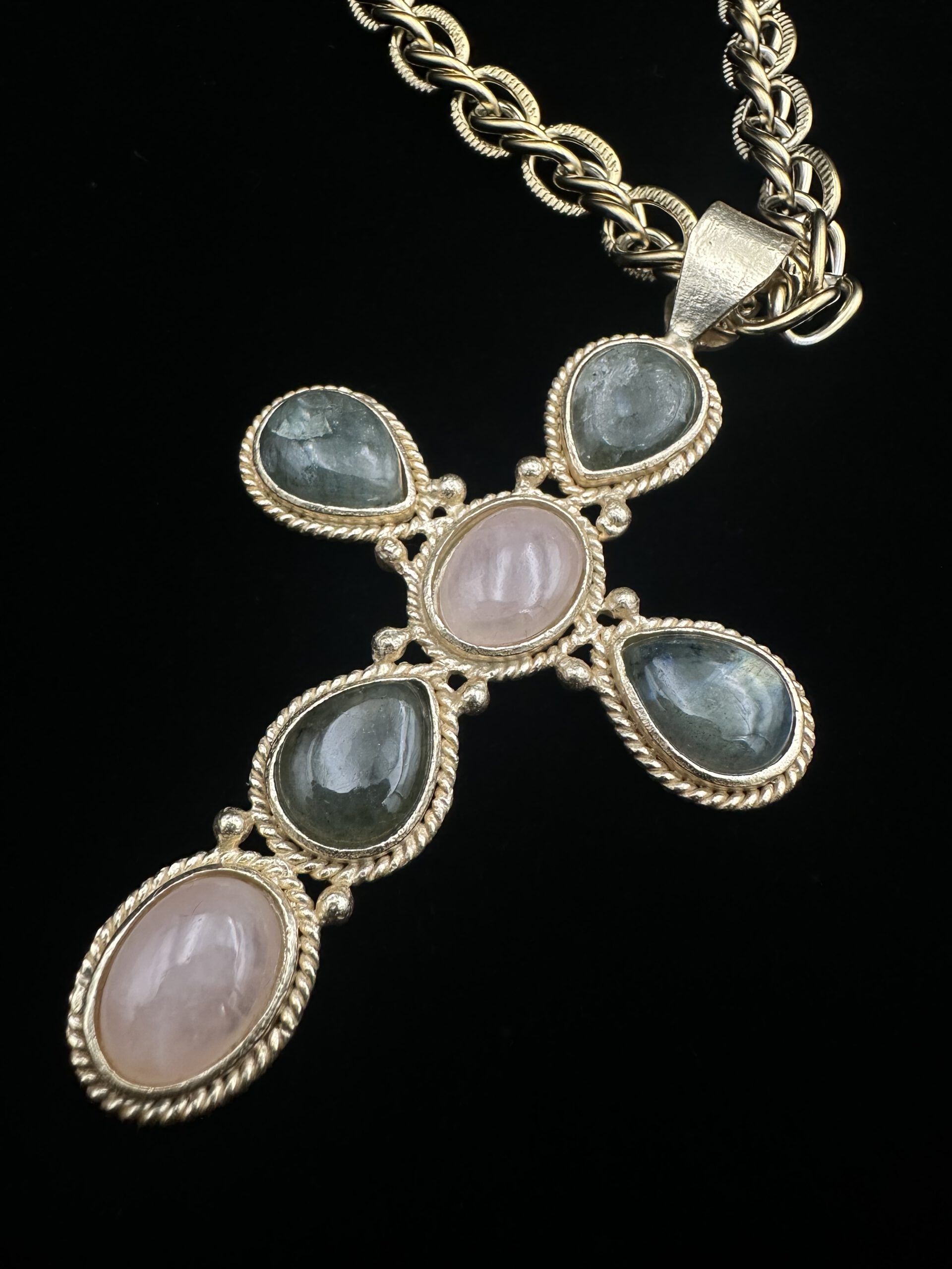 Dieser besondere Anhänger in Kreuzform kombiniert die schimmernden Nuancen von Labradorit mit der sanften, warmen Ausstrahlung von Rosenquarz. Das harmonische Zusammenspiel beider Edelsteine steht für Schutz, Klarheit und Herzenergie – perfekt für alle, die natürliche Schönheit und spirituelle Balance schätzen.