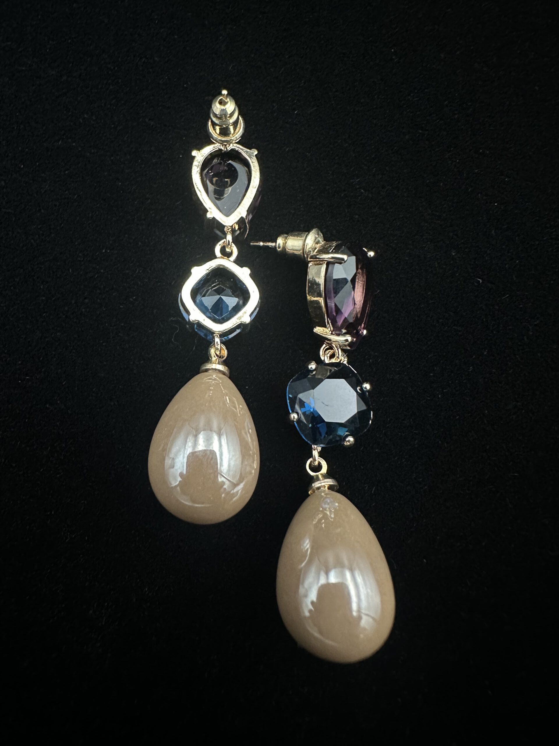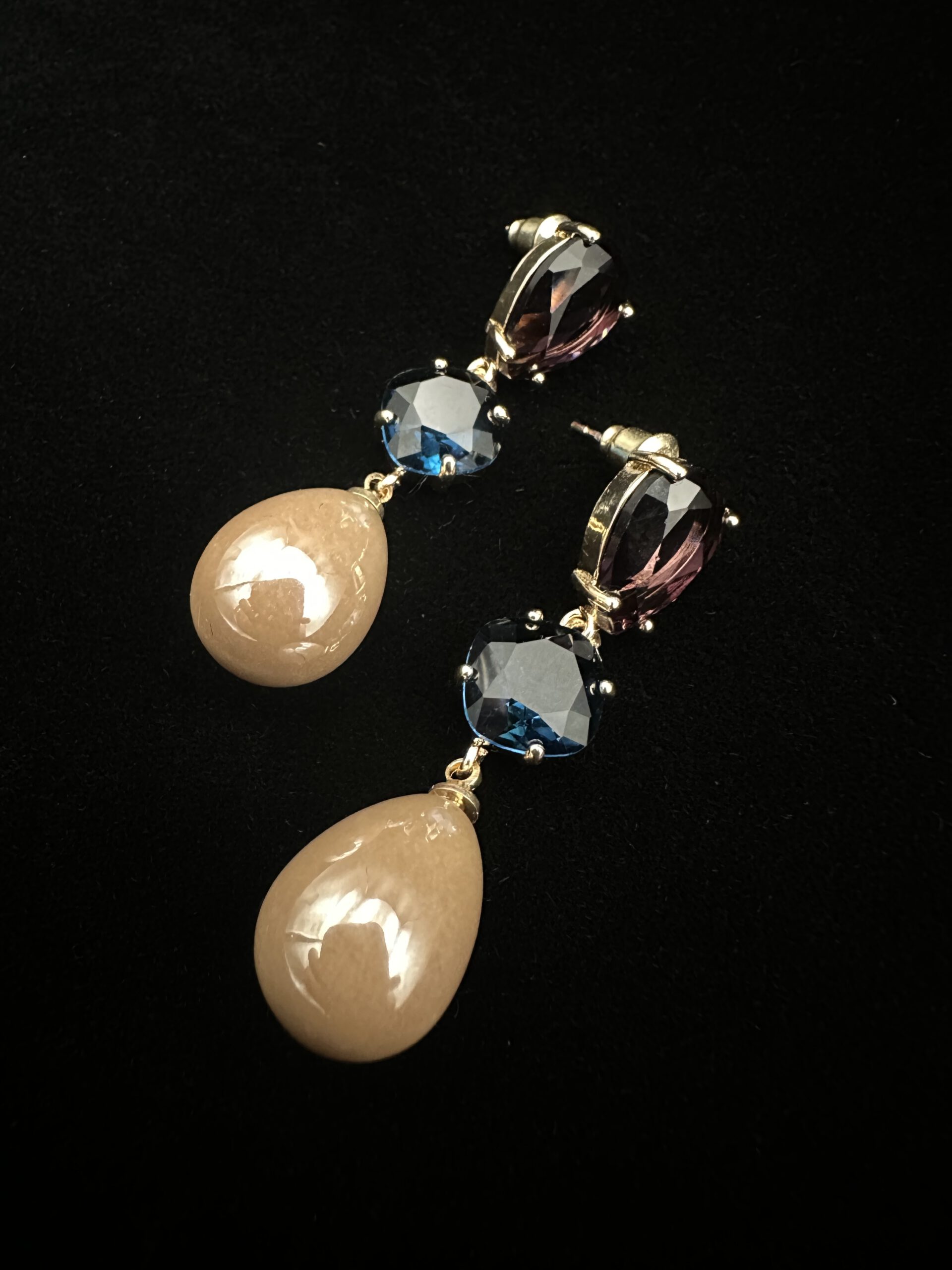 Diese einzigartigen Ohrringe vereinen einen sanft sandschimmernden Perlentropfen mit einem tiefblauen Mittelstück und einem zarten lilafarbenen Steckerteil. Das harmonische Zusammenspiel der Farben schafft einen eleganten, verspielten Look und verleiht jedem Outfit einen stilvollen, farbenfrohen Akzent.