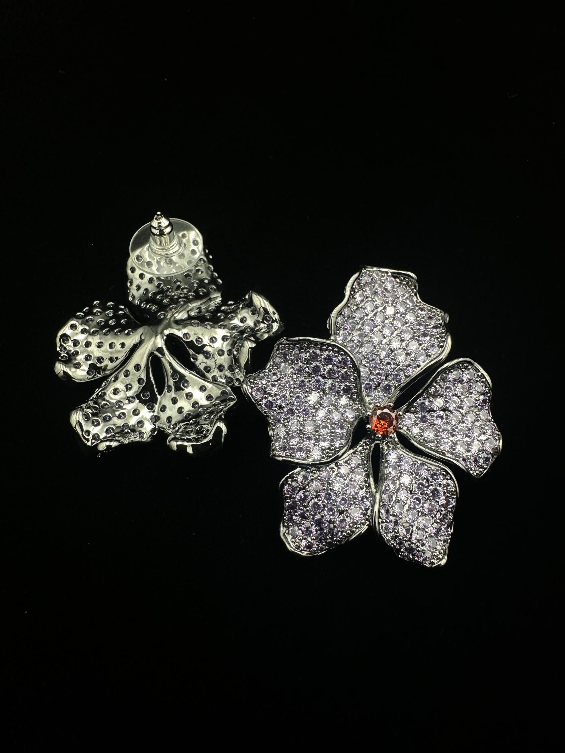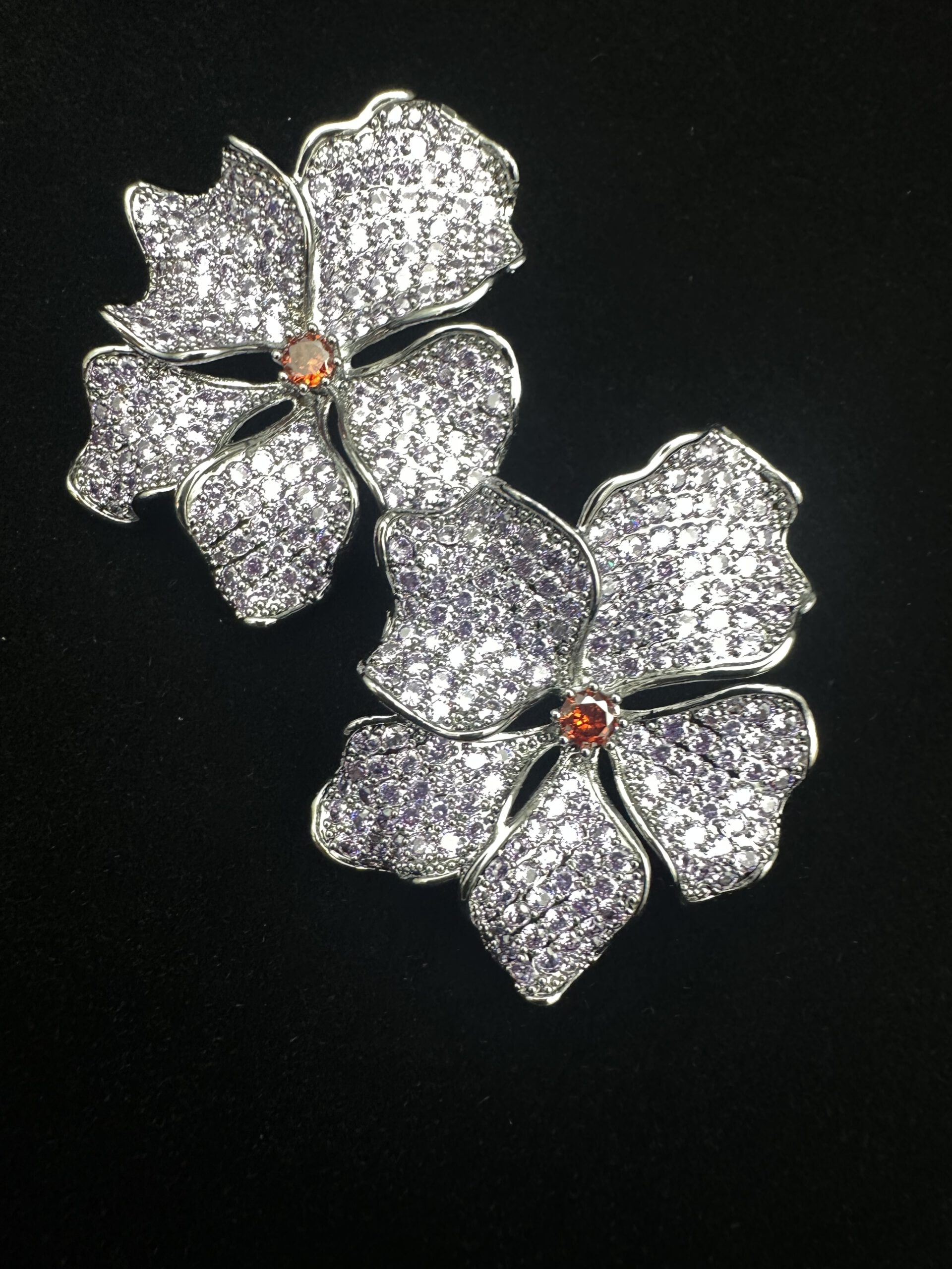 Diese zauberhaften Ohrringe präsentieren eine große Blüte in zartem Flieder, kunstvoll eingefasst in silberfarbene Elemente. Funkelnde Strasssteine setzen strahlende Highlights und lassen das florale Design lebendig wirken. Ein poetisches, elegantes Accessoire, das jedem Look eine sanfte, romantische Note verleiht.