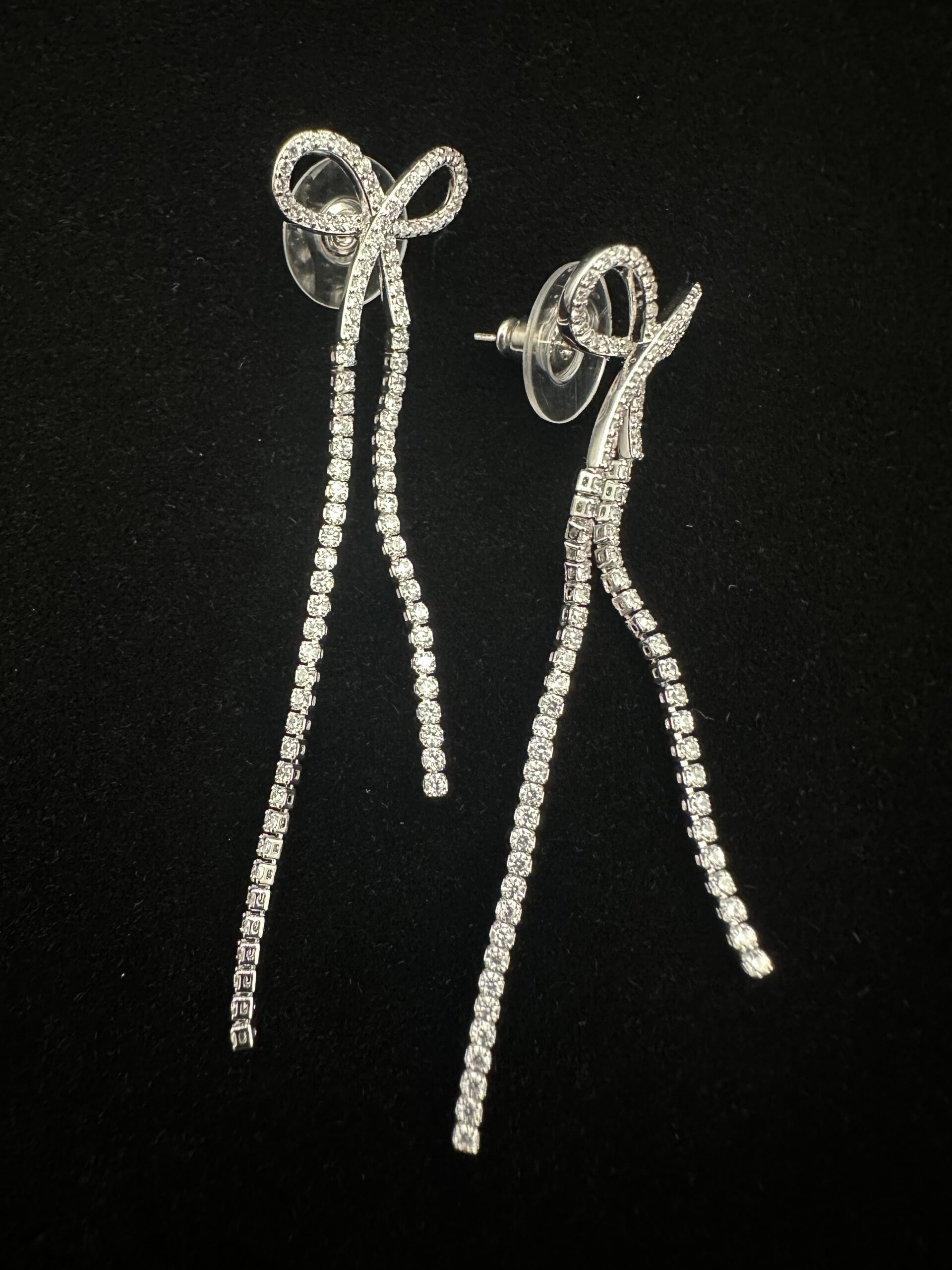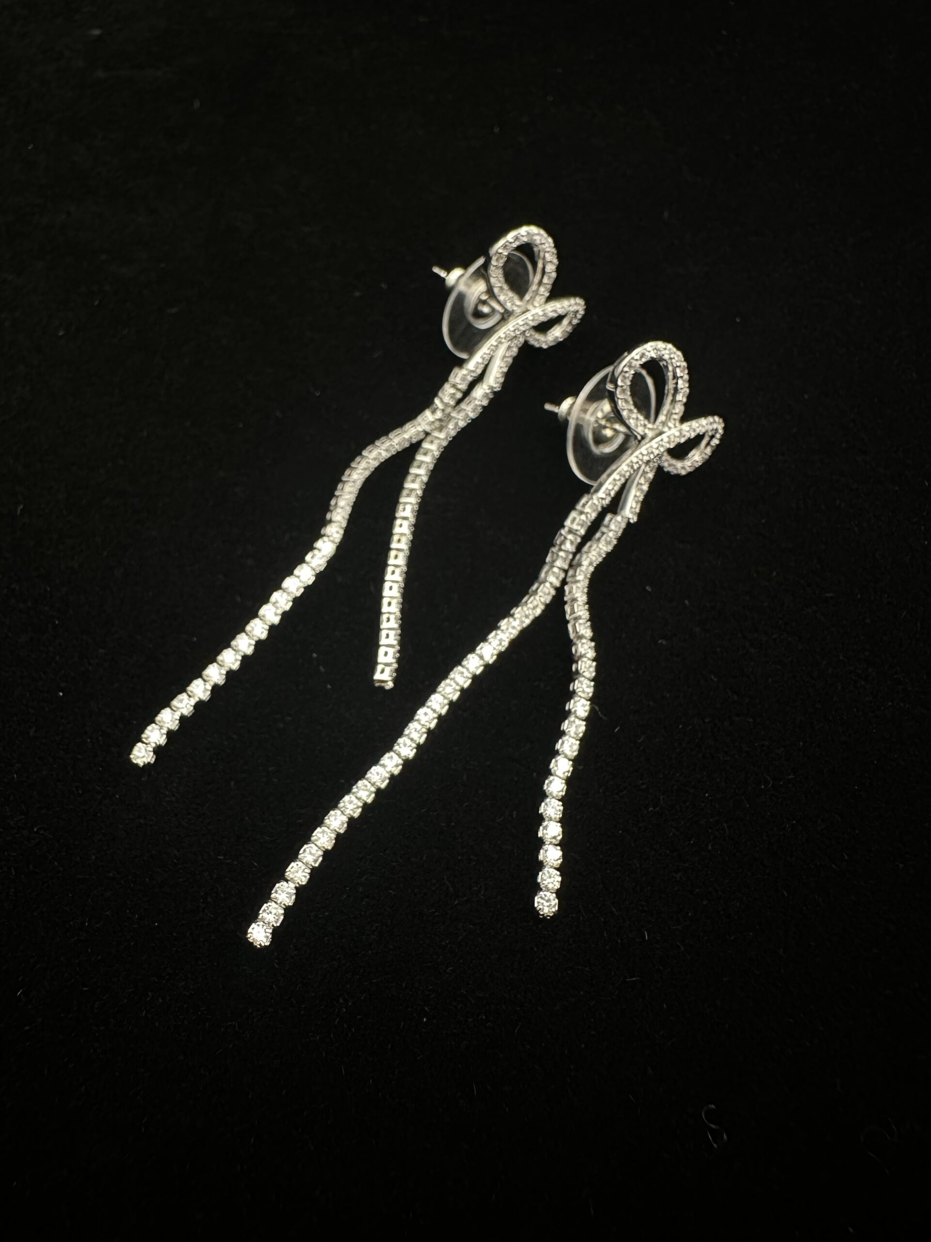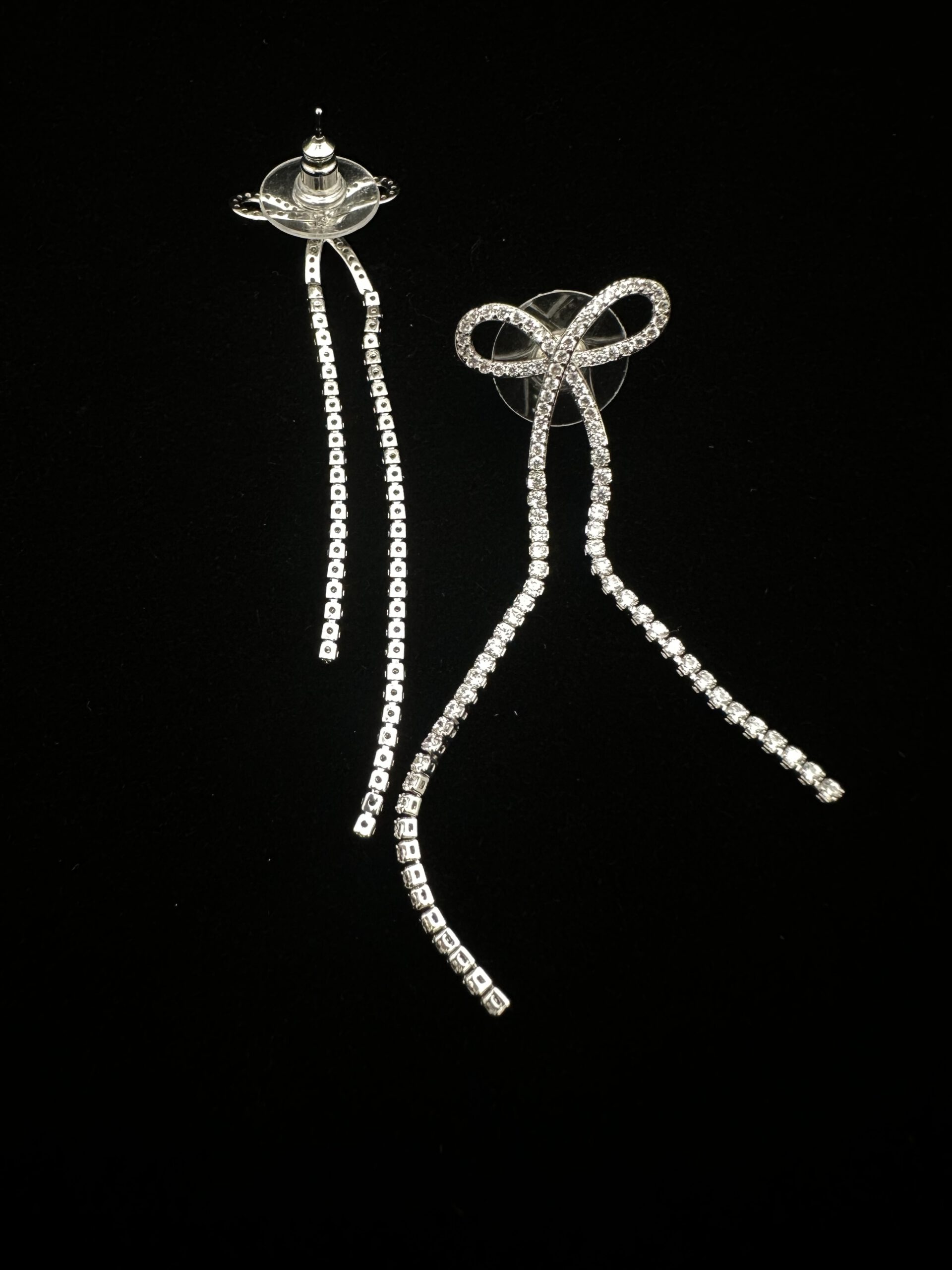 Diese feinen Ohrringe bezaubern mit einer filigranen Schleife, die vollständig mit funkelnden Strasssteinen besetzt ist. Das zarte Design spielt mit Licht und Bewegung und verleiht jedem Look eine edle, feminine Note. Perfekt für alle, die subtile Eleganz und ein Hauch von Glamour lieben.