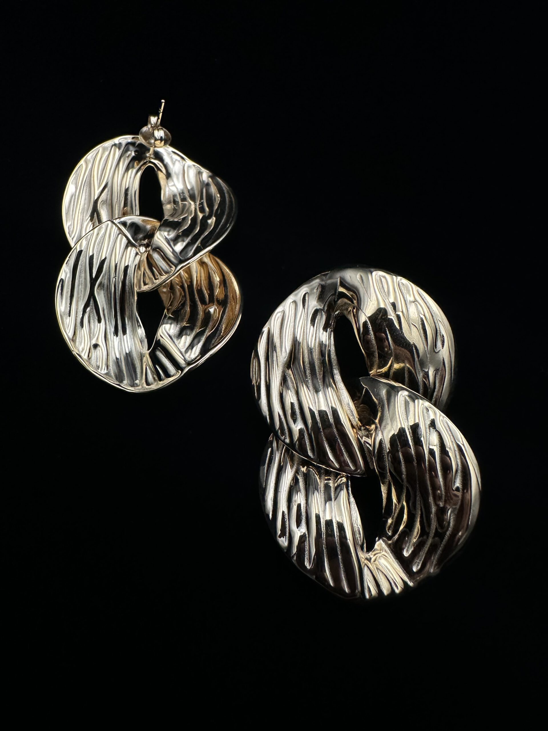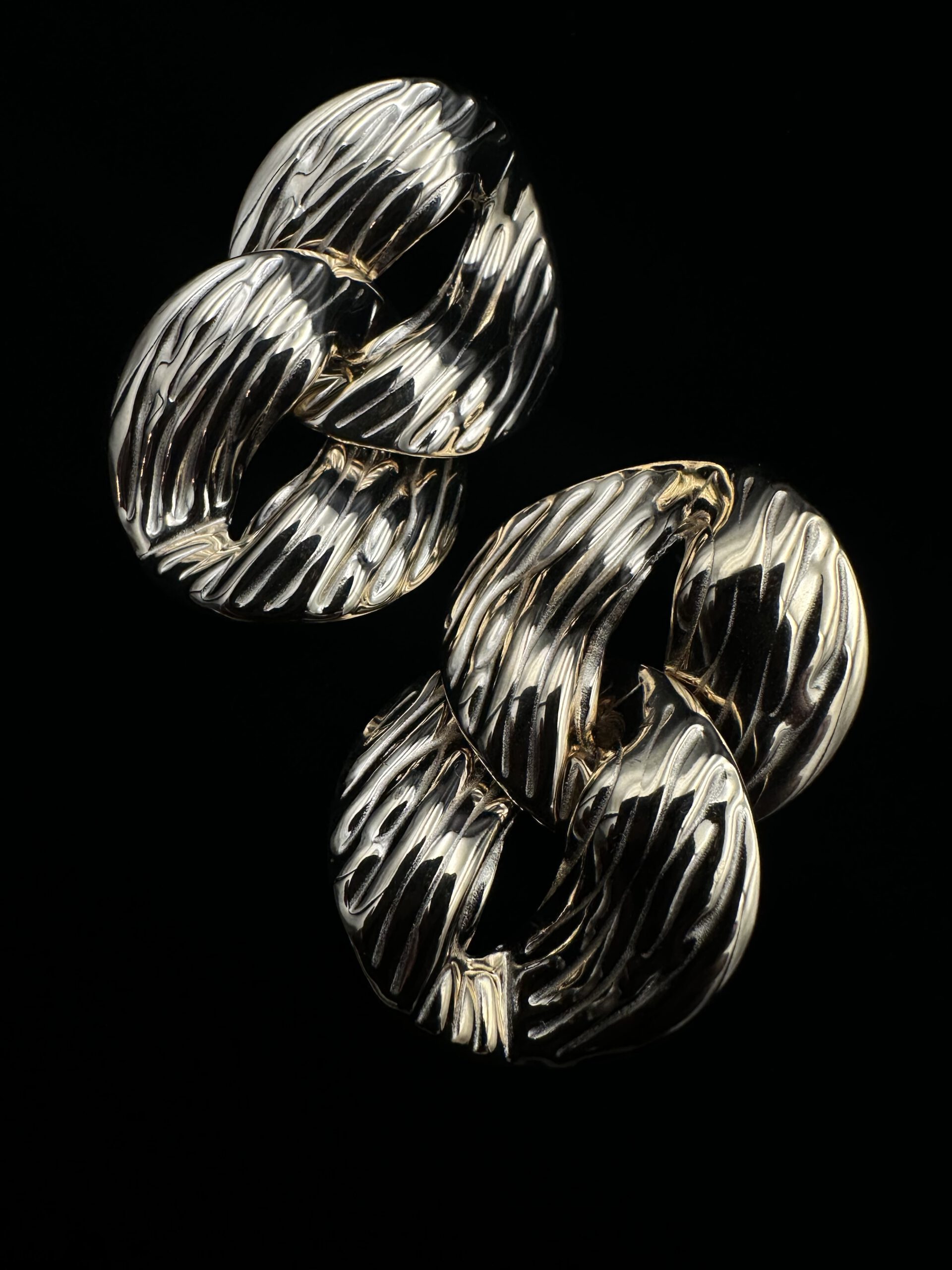 Diese markanten Ohrringe bestehen aus zwei großen, ineinander verschlungenen Kettengliedern in warm schimmerndem Gold. Das moderne, klare Design verleiht jedem Look einen stilvollen, zeitgemäßen Akzent – perfekt für alle, die auffällige Eleganz lieben.