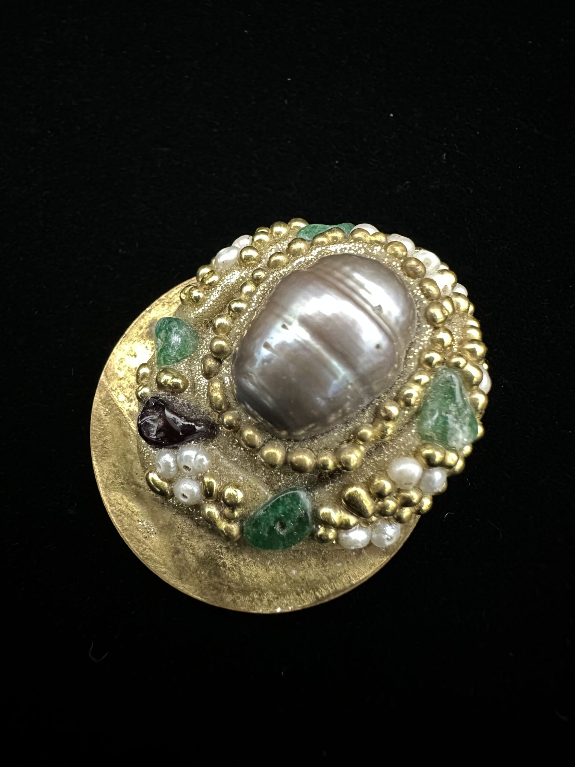 Dieser zauberhafte Anhänger vereint Vintage-Charme mit verspieltem Detailreichtum: Filigranes goldfarbenes Metall, geschmückt mit kleinen Perlchen und zartgrünen Steinchen, verleiht ihm eine besondere, fast magische Ausstrahlung. Ein einzigartiges Schmuckstück für alle, die fantasievolle Eleganz lieben.