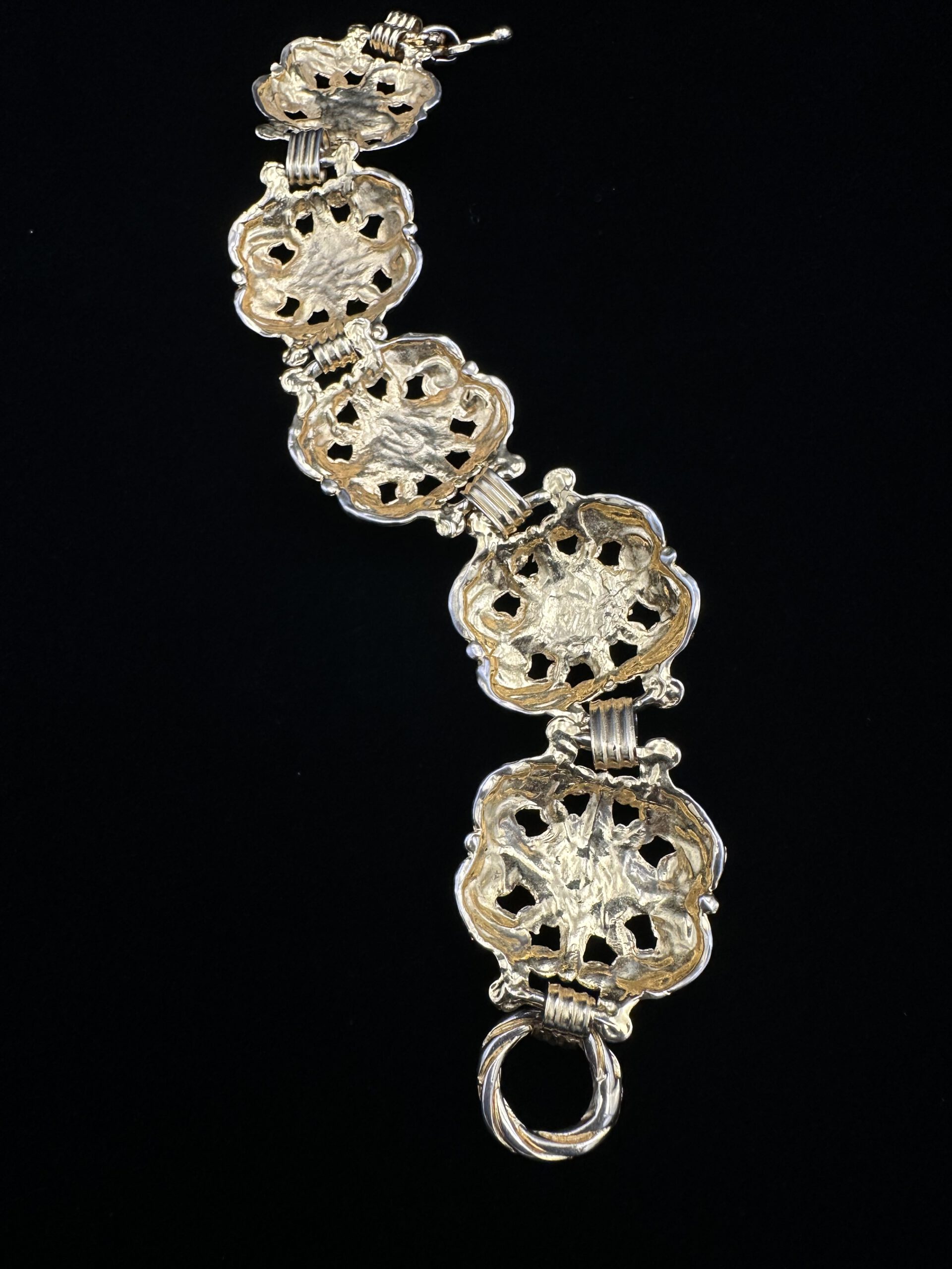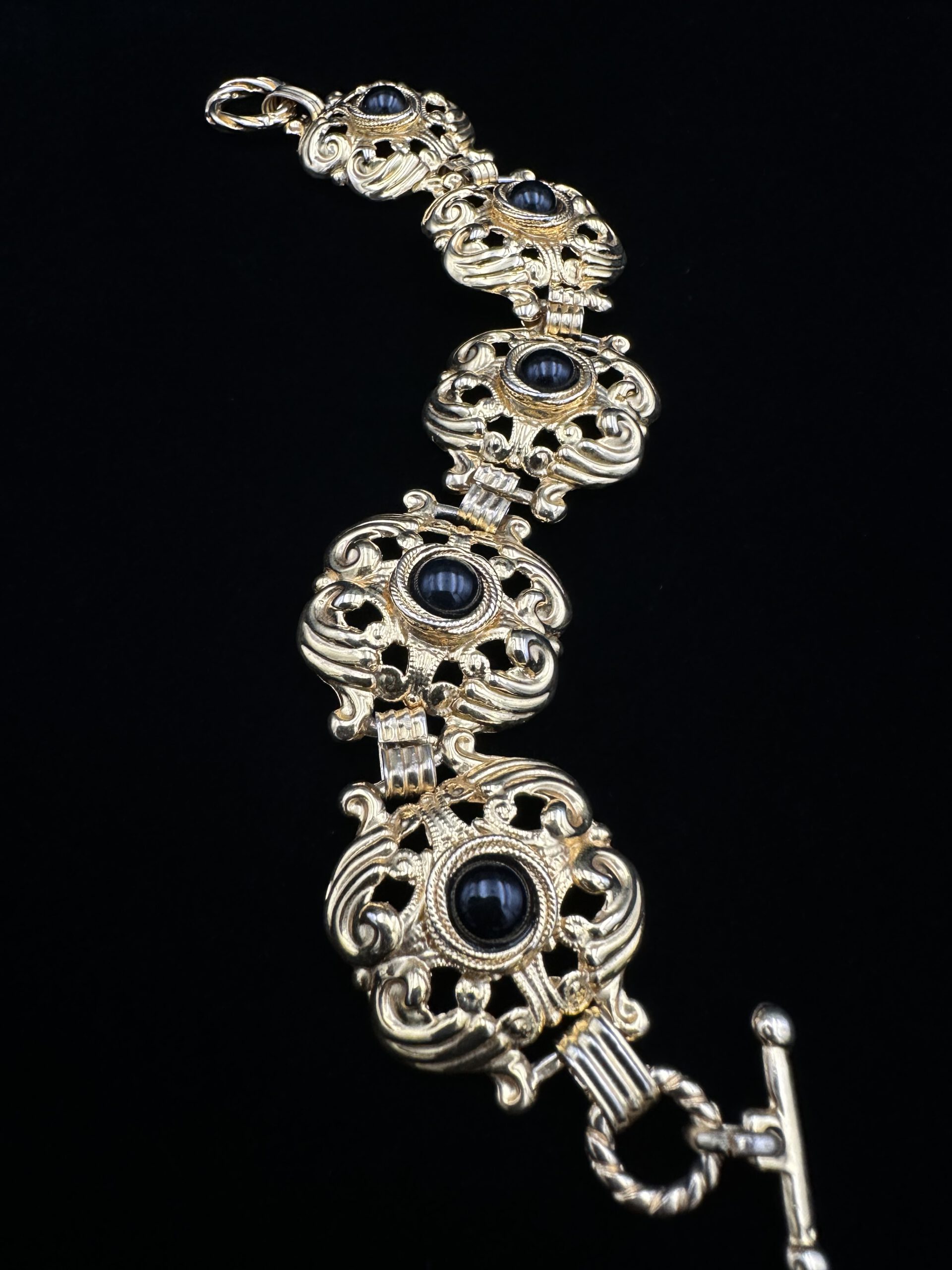 Dieses elegante Vintage-Armband verbindet kunstvolle Verzierung mit dem edlen Kontrast tiefschwarzer Steine. Der warme Goldton und die filigranen Details verleihen dem Stück eine zeitlose, leicht dramatische Ausstrahlung – ein besonderes Accessoire für Liebhaber:innen raffinierter Vintage-Eleganz.