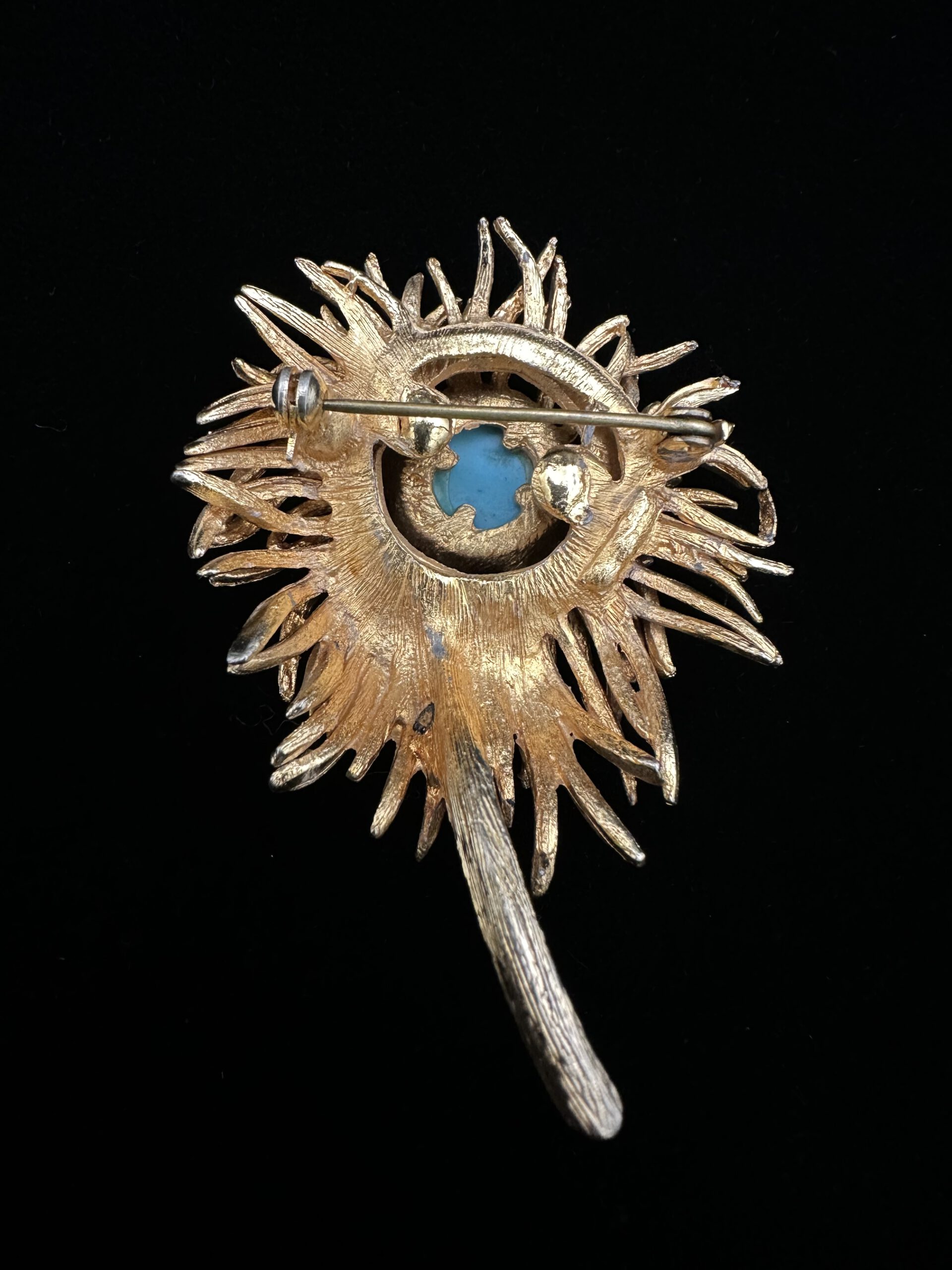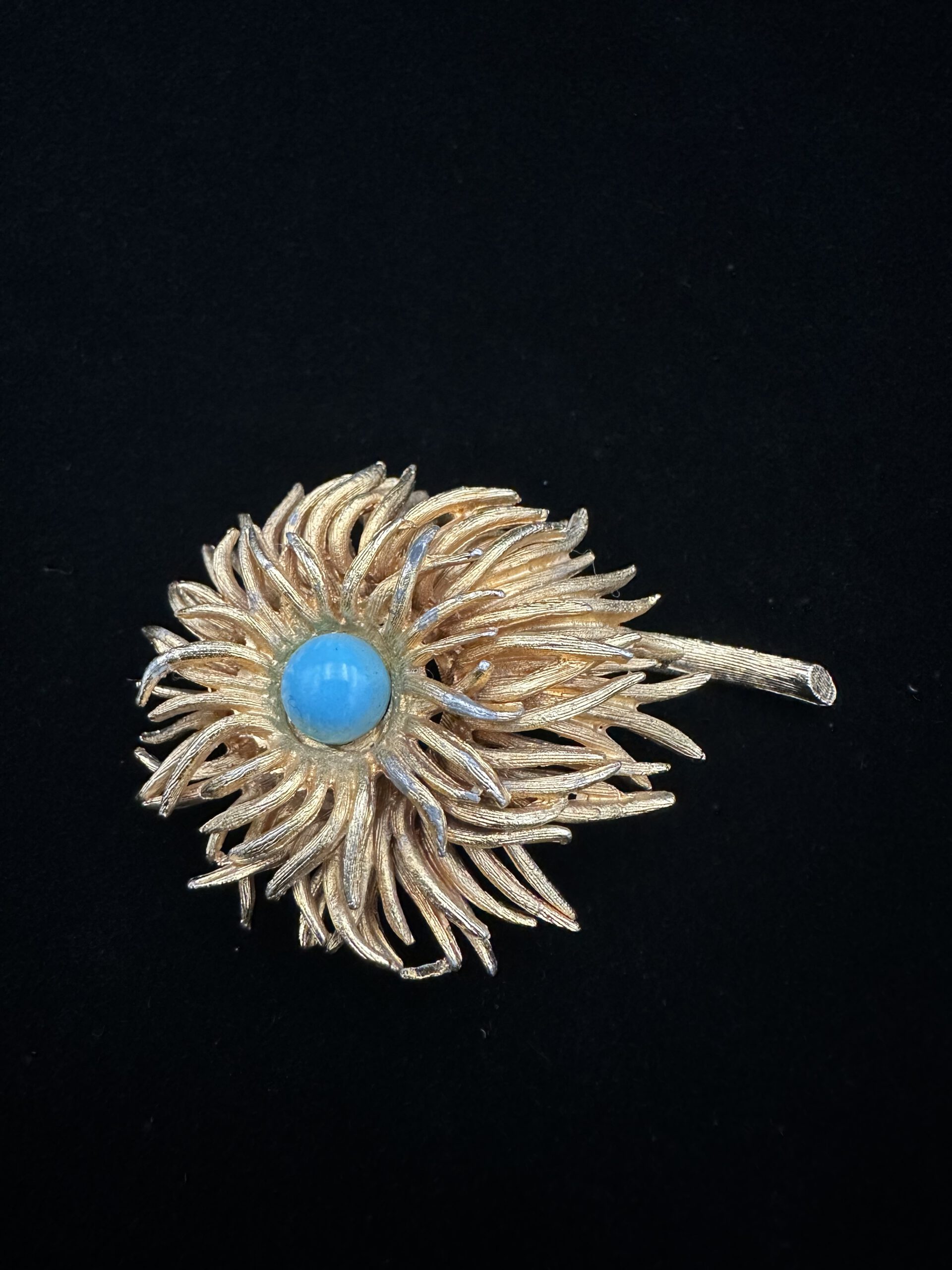 Diese goldfarbene Vintage-Brosche in Form einer anemonenartigen Blüte, ist kunstvoll gearbeitet und mit feinen Details versehen. Im Zentrum sitzt ein türkisfarbener Stein, der der Brosche eine frische, lebendige Note verleiht. Ein elegantes Schmuckstück, das florale Leichtigkeit mit nostalgischem Vintage-Charme verbindet und besondere Akzente setzt.