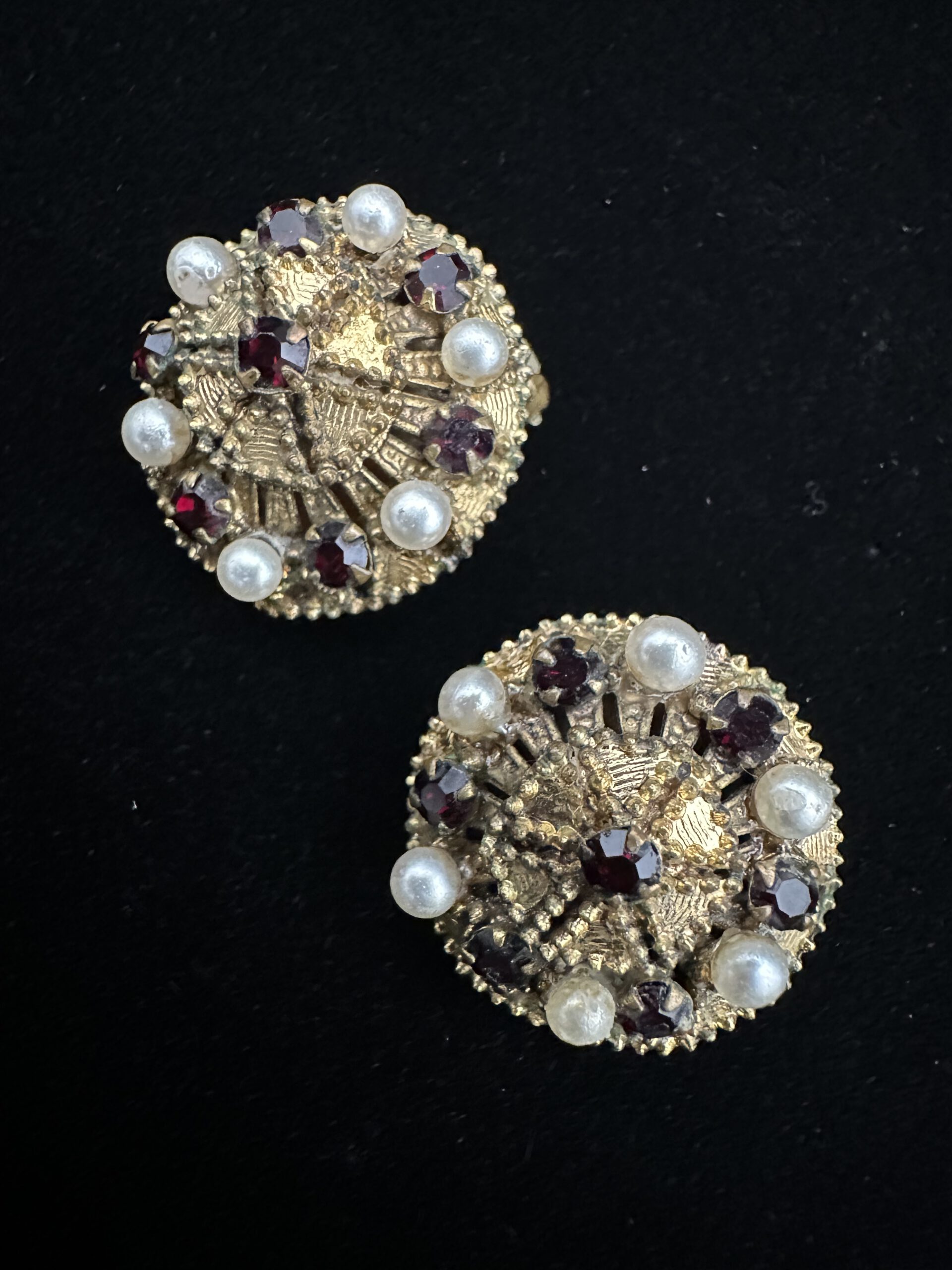 Diese goldfarbenen Vintage-Ohrclips sind kunstvoll verziert und verbinden klassische Eleganz mit liebevollen Details. Kleine rote Steinchen setzen lebendige Akzente und werden harmonisch durch zarte Perlen ergänzt. Ein charaktervolles Schmuckstück mit nostalgischem Charme, das besondere Momente stilvoll unterstreicht und deinem Look eine warme, feminine Note verleiht.