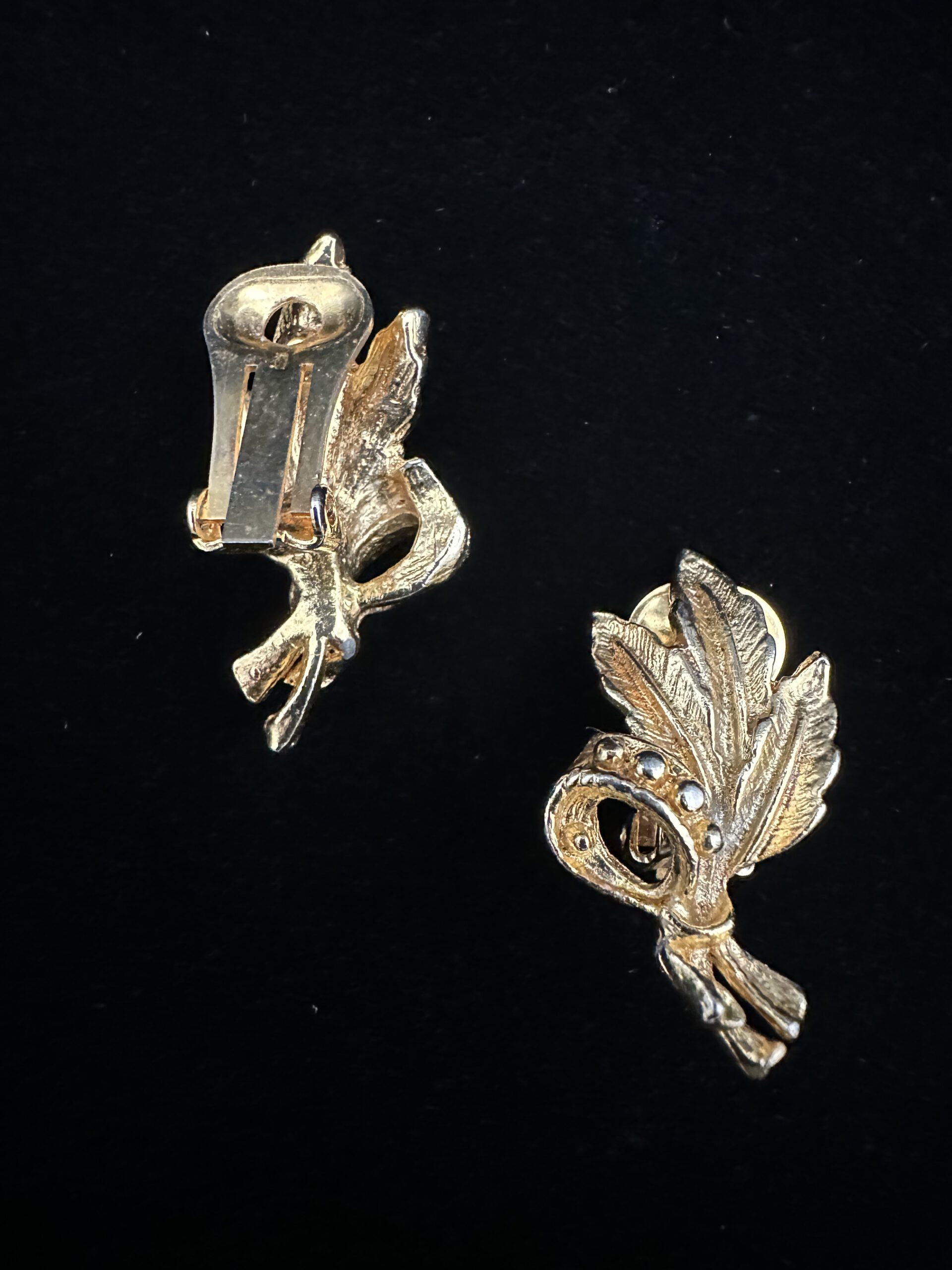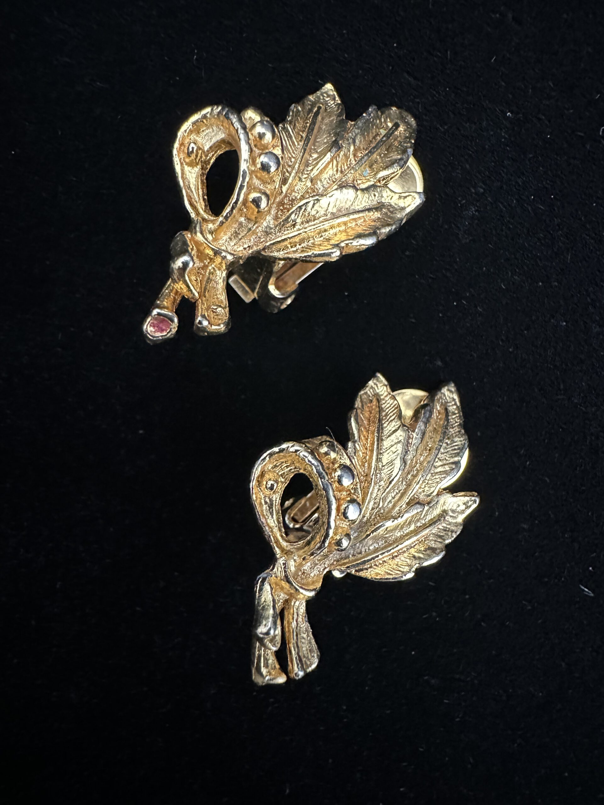 Diese goldfarbenen Vintage-Ohrclips sind in Form eines kleinen Straußes aus feinen Federn gestaltet und kunstvoll verziert. Die filigrane Formgebung verleiht ihnen eine leichte, fast schwebende Ausstrahlung und bringt eleganten Vintage-Charme zum Ausdruck. Ein besonderes Schmuckstück, das Natürlichkeit und Stil verbindet und jedem Look eine sanfte, individuelle Note verleiht.