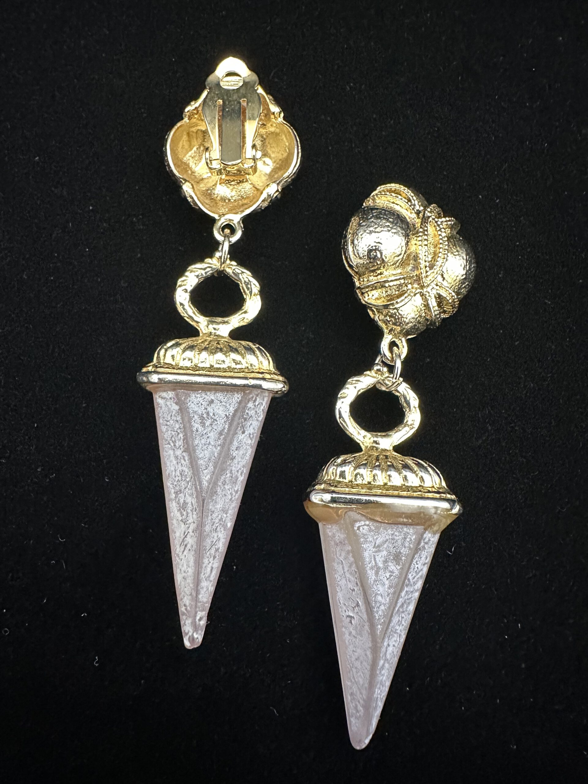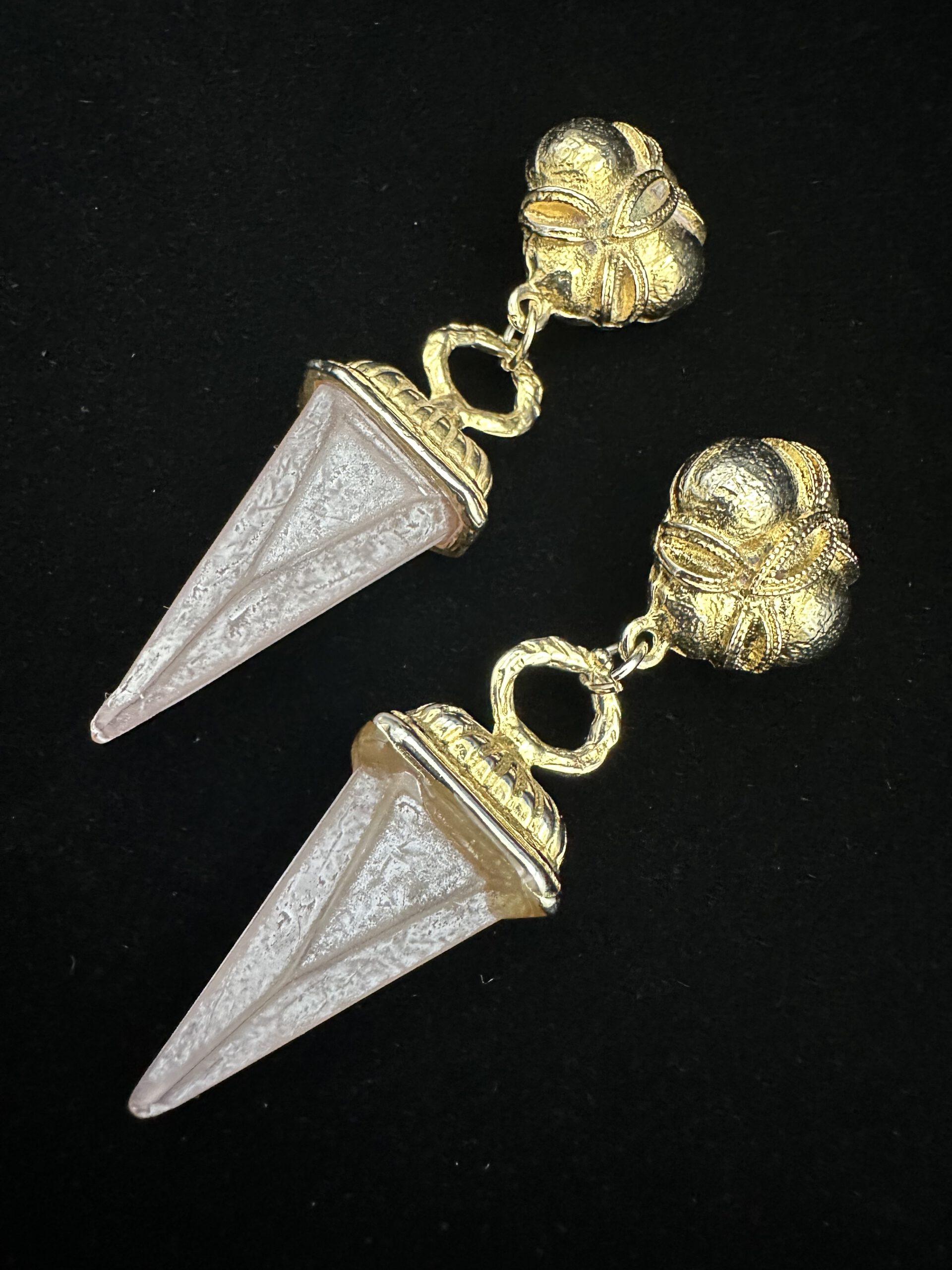 Diese goldfarbenen Vintage-Ohrclips bezaubern mit einem außergewöhnlichen Anhänger in Form eines rosafarbenen Obelisken. Die zart schimmernden Steine verleihen dem Design eine anmutige Eleganz, während die warm glänzende Fassung den charmanten Retro-Charakter unterstreicht. Ein besonderes Schmuckstück, das jedem Outfit eine poetische, leicht verspielte Note verleiht – ideal für Liebhaberinnen individueller Vintage-Akzente im grünen Salon.