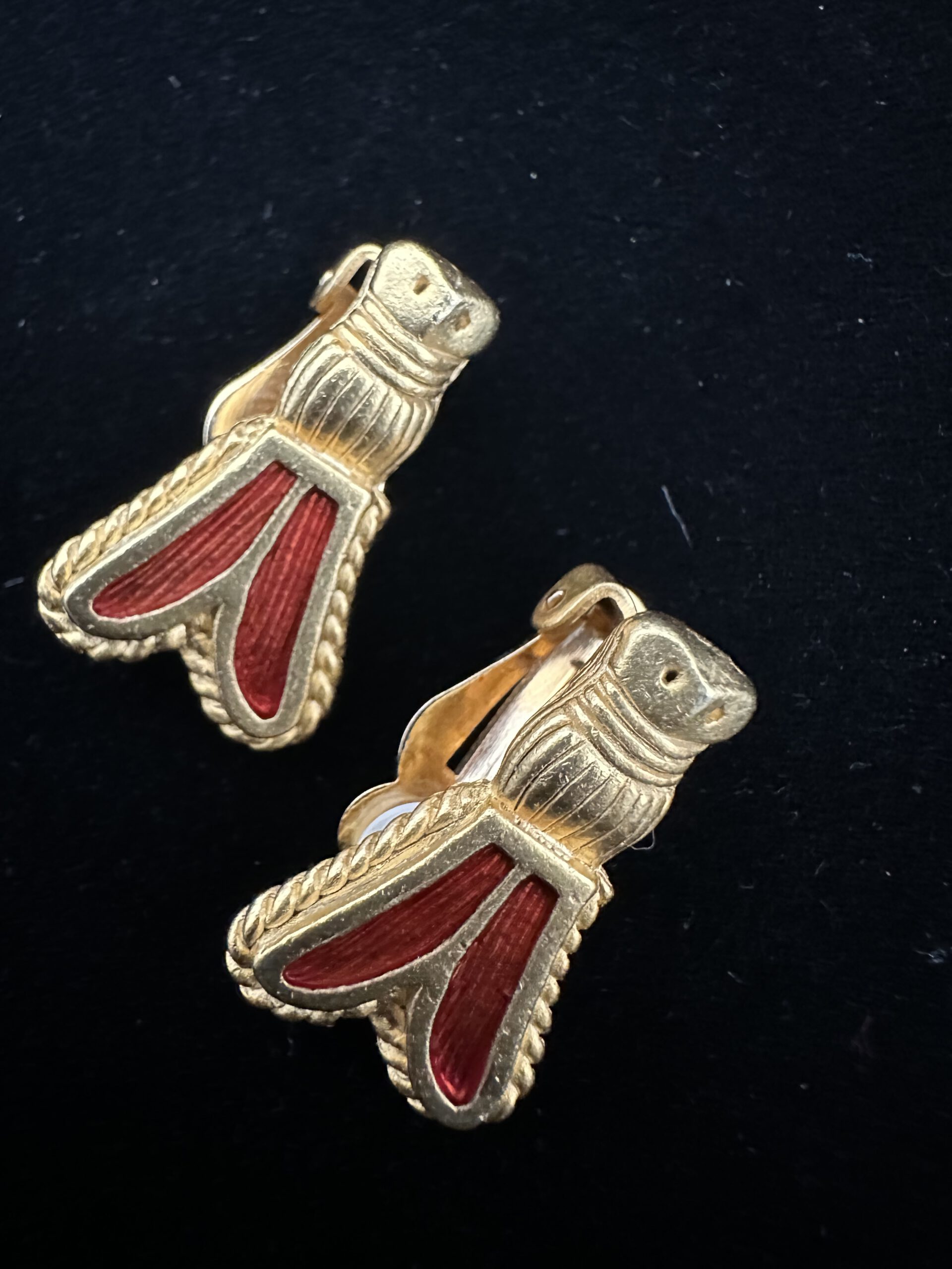 Diese außergewöhnlichen goldfarbenen Vintage Ohrclips in Form einer zierlichen Zikade sind ein echter Blickfang und ein charmantes Statement-Piece für Liebhaber*innen besonderer Schmuckkunst. Fein gearbeitet und mit liebevollen Details versehen, fangen sie die Eleganz und Symbolkraft des kleinen Insekts stilvoll ein. Die signierten Clips zeugen von hochwertiger Handwerkskunst und verleihen jedem Outfit eine spielerisch-edle Note. Perfekt für alle, die gerne das Besondere tragen und ihrem Look eine kunstvolle, vintage-inspirierte Nuance verleihen möchten.