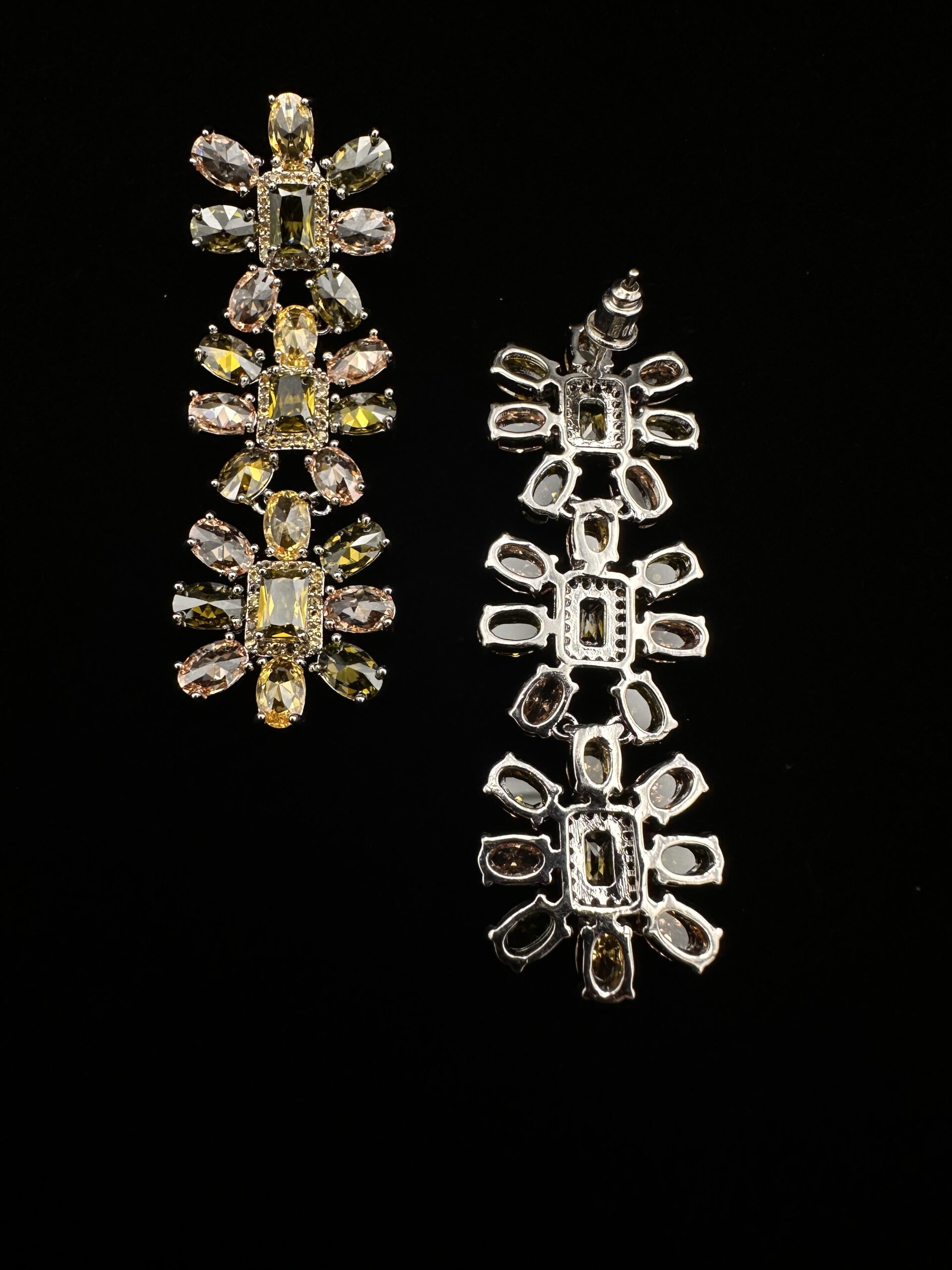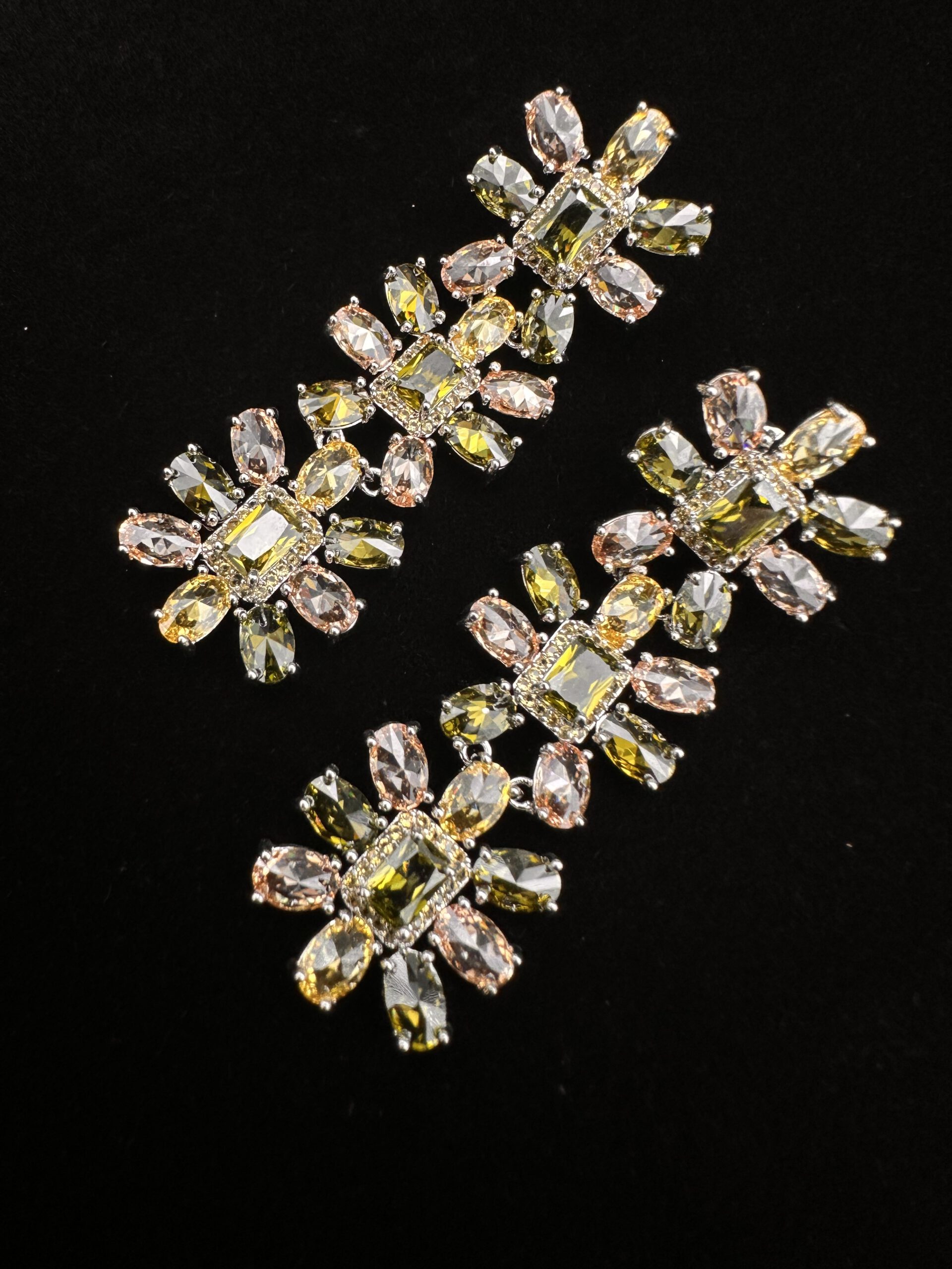 Diese bezaubernden Ohrringe sind mit drei untereinander angeordneten Blüten gestaltet, die in zarten Grüntönen schimmern. Das filigrane, florale Design wirkt leicht und feminin. Ein wunderschönes Modeschmuckstück, das jedem Outfit eine frische und elegante Note verleiht.