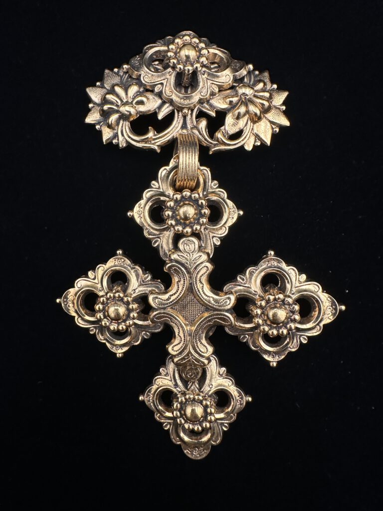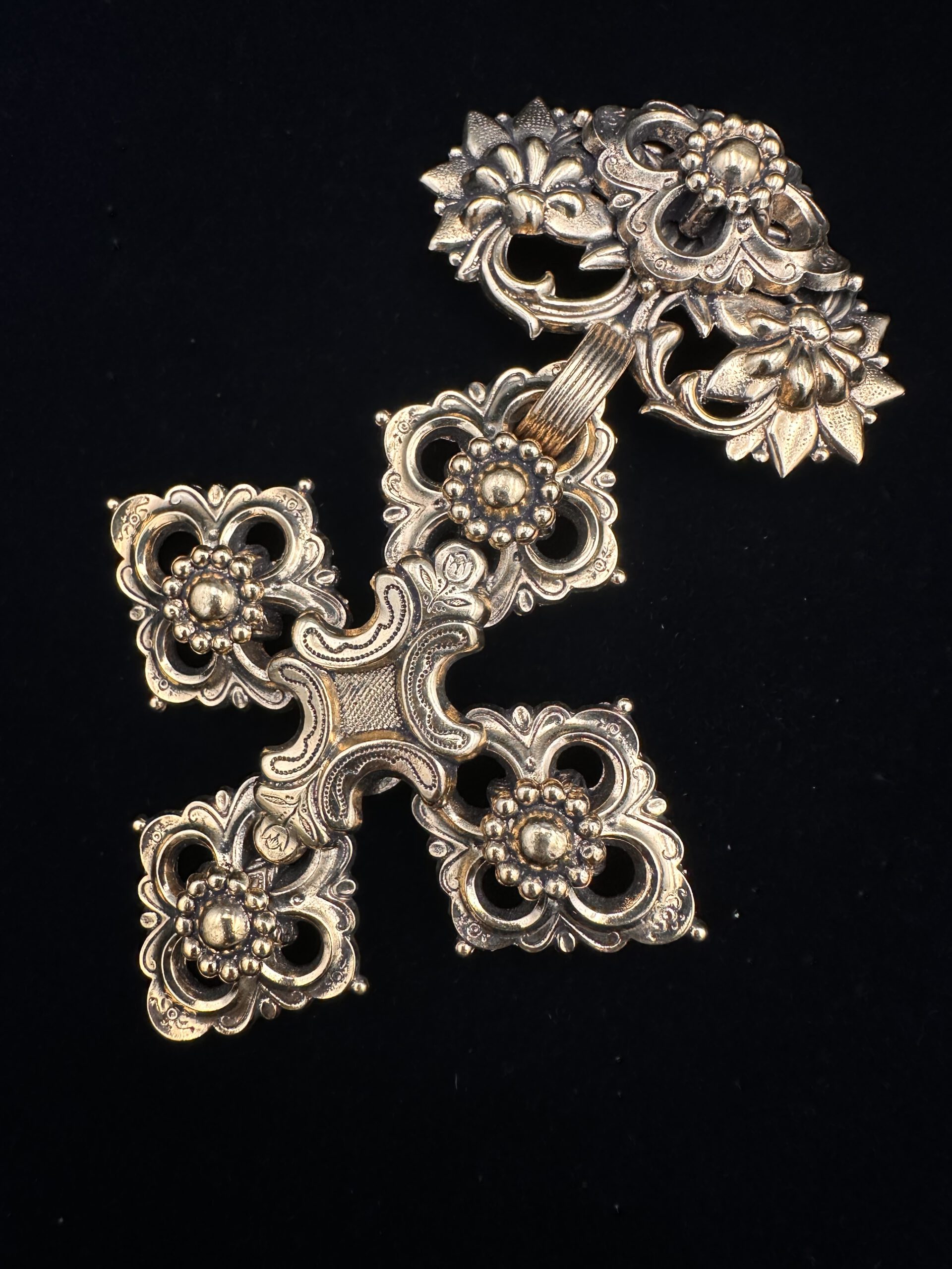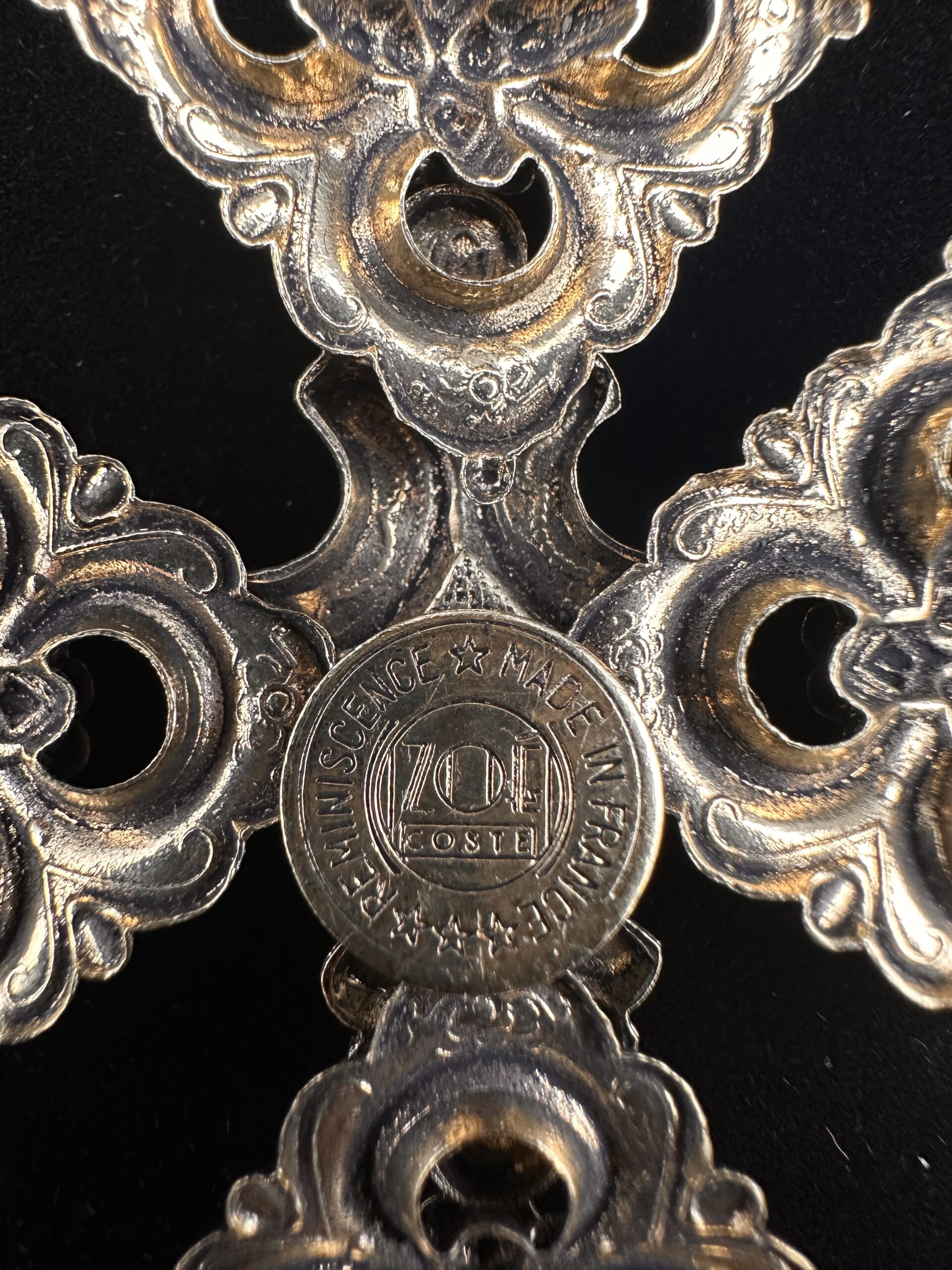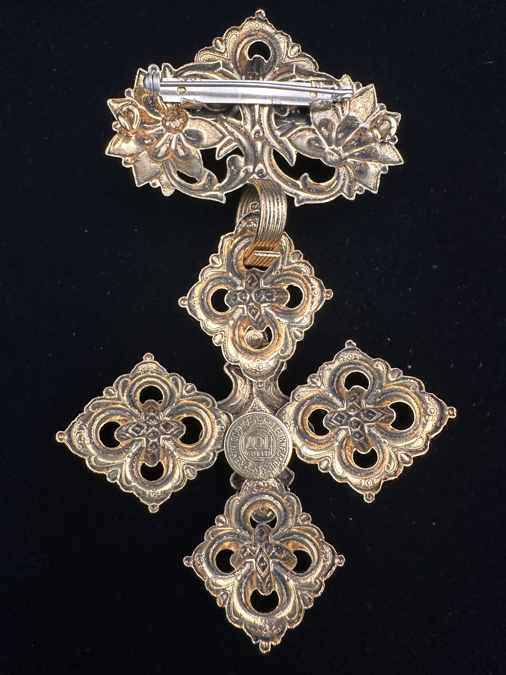 Diese außergewöhnliche Vintage-Brosche von Reminiscence besticht durch ihr kunstvoll gestaltetes, großes Kreuz in edlem Goldton. Die detailreiche Verzierung verleiht dem Schmuckstück einen einzigartigen, nostalgischen Charme und macht es zu einem echten Blickfang. Signiert von Reminiscence, steht diese Brosche für hochwertige Verarbeitung und zeitlose Eleganz – perfekt, um jedem Outfit eine besondere, stilvolle Note zu verleihen.