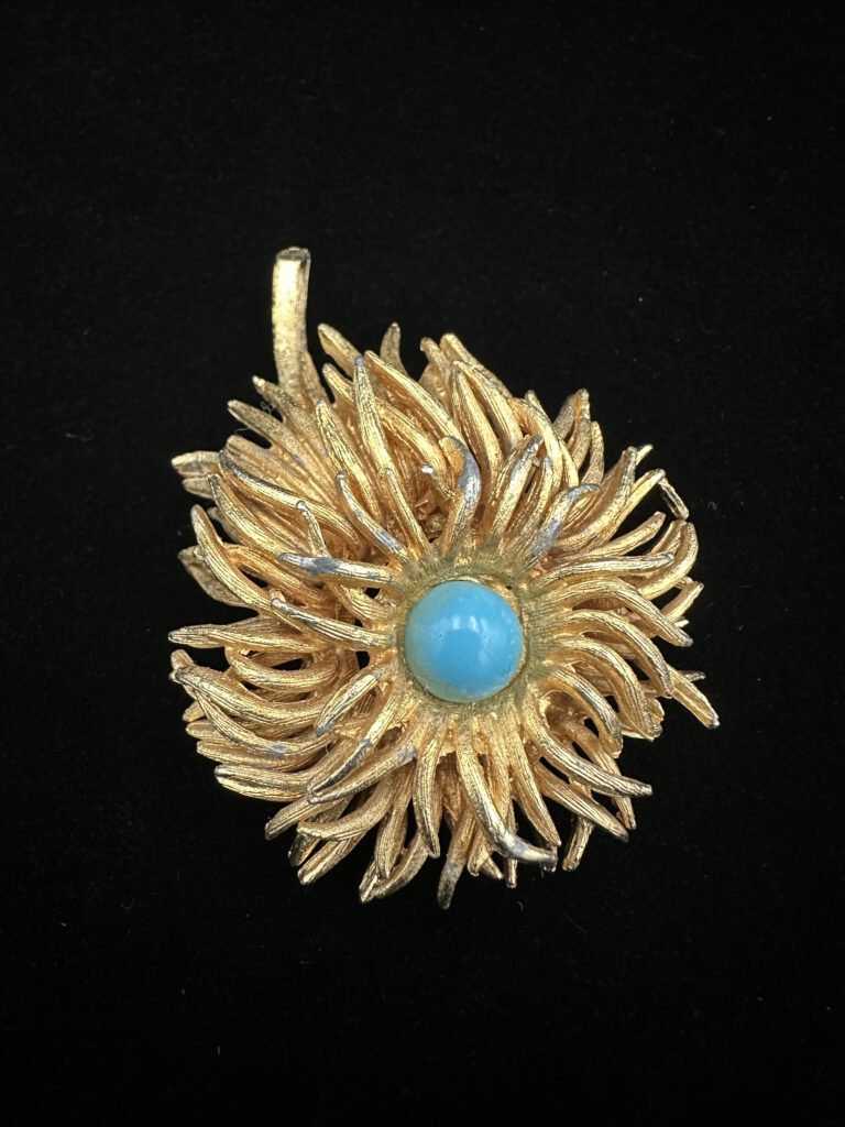 Diese goldfarbene Vintage-Brosche in Form einer anemonenartigen Blüte, ist kunstvoll gearbeitet und mit feinen Details versehen. Im Zentrum sitzt ein türkisfarbener Stein, der der Brosche eine frische, lebendige Note verleiht. Ein elegantes Schmuckstück, das florale Leichtigkeit mit nostalgischem Vintage-Charme verbindet und besondere Akzente setzt.