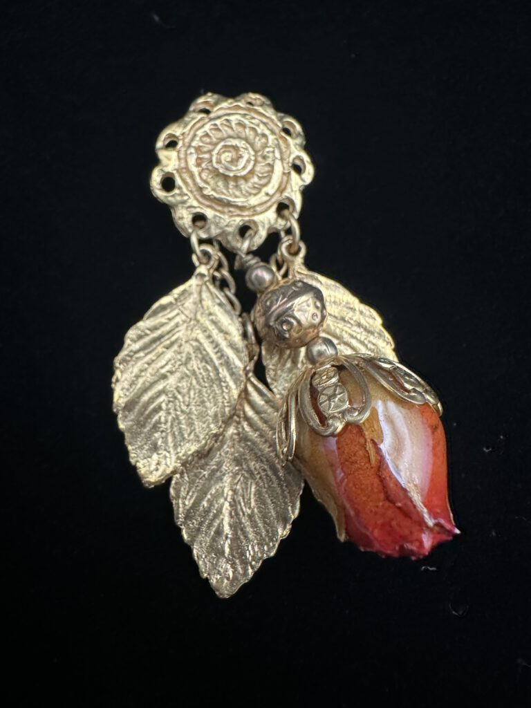 Goldfarbene Vintage-Brosche mit einer zarten, echten Rose als besonderes Highlight, umgeben von fein gearbeiteten goldenen Blättern. Die Brosche ist signiert von Saoya und verbindet natürliche Eleganz mit nostalgischem Charme – ein ausdrucksstarkes Schmuckstück für Liebhaber:innen außergewöhnlicher Details.