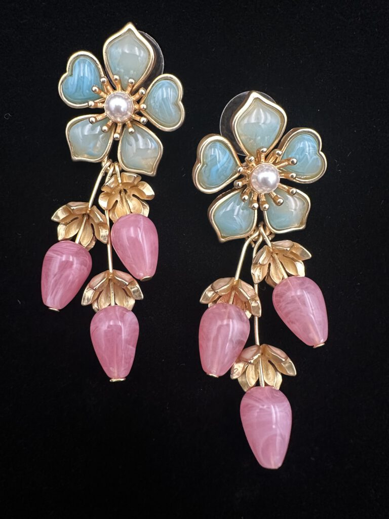 Diese wunderschönen Blüten-Ohrringe verzaubern mit einem filigranen Steckerteil in Form einer bläulich schimmernden Blüte, an der elegante roséfarbene Tropfenanhänger sanft herabfallen. Das Zusammenspiel aus kühlem Schimmer und warmer Farbnuance schafft einen harmonischen, romantischen Look.