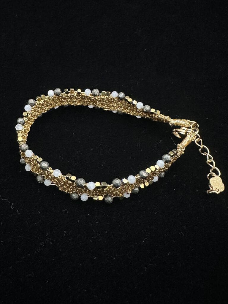 Dieses besondere Armband besticht durch seine fein gestrickte Optik in warmem Goldton, verziert mit zarten weißen und anthrafarbenen Perlenakzenten. Ein filigranes, verspieltes Schmuckstück, das jedem Look einen femininen und eleganten Touch verleiht.