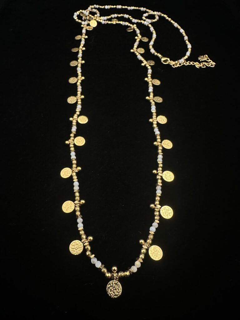 Diese edle, lange Kette aus zart schimmernden cremefarbenen Turmalinen wird von feinen goldfarbenen Plättchen begleitet. Das sanfte, natürliche Farbspiel und die leichte Bewegung der Plättchen verleihen ihr eine elegante, moderne Leichtigkeit – ein vielseitiges Schmuckstück für jeden Anlass.