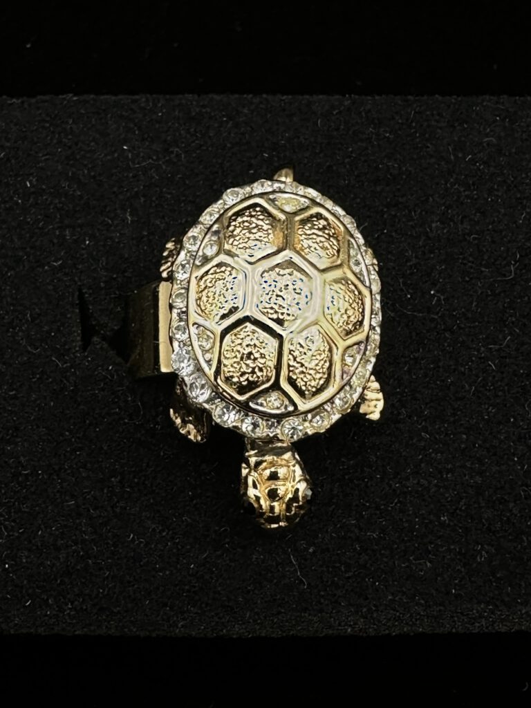 Ein verspieltes Schmuckstück mit außergewöhnlichem Charme: Dieser Vintage Ring zeigt eine kunstvoll gearbeitete Schildkröte, deren Kopf, Beine und Schwänzchen beweglich sind. Verziert mit funkelnden Strasssteinen wird er zum strahlenden Hingucker und verleiht jedem Look eine besondere, lebendige Note.