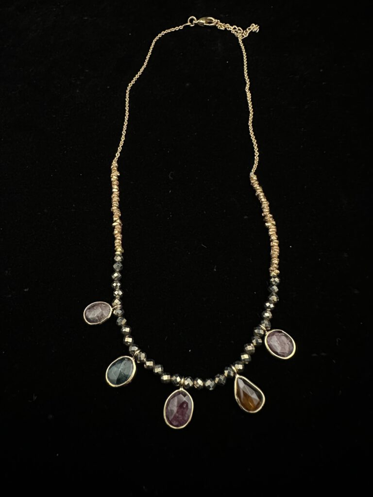 Diese feine, vergoldete Kette wird von fünf kleinen Anhängern aus Multi-Turmalinen geschmückt. Die sanft schimmernden Farbnuancen der Edelsteine verleihen dem zarten Design eine lebendige, natürliche Eleganz – ein filigranes Schmuckstück, das jedem Look einen Hauch von Farbpoesie verleiht.