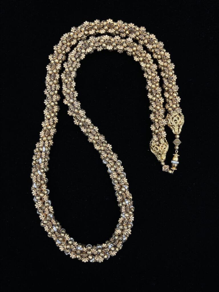 Diese wunderschöne, detailreiche Vintage-Kette in Goldoptik besticht durch ihr aufwendig gearbeitetes Design mit filigranen Blütenelementen und funkelnden Steinen. Die feinen Details verleihen ihr eine besondere Eleganz und machen sie zu einem echten Blickfang. Ein stilvolles Schmuckstück, das jedem Outfit eine edle und feminine Note verleiht.