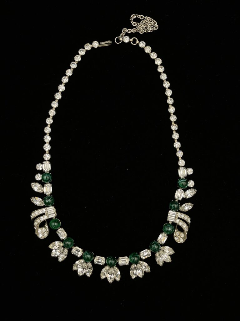 Diese elegante Vintage-Kette überzeugt durch ihr stilvolles Design mit fein eingearbeiteten grünen Steinen. Die funkelnden Elemente verleihen ihr eine besondere Ausstrahlung und setzen edle Akzente. Ein ausdrucksstarkes Schmuckstück, das jedem Outfit eine stilvolle und individuelle Note verleiht.