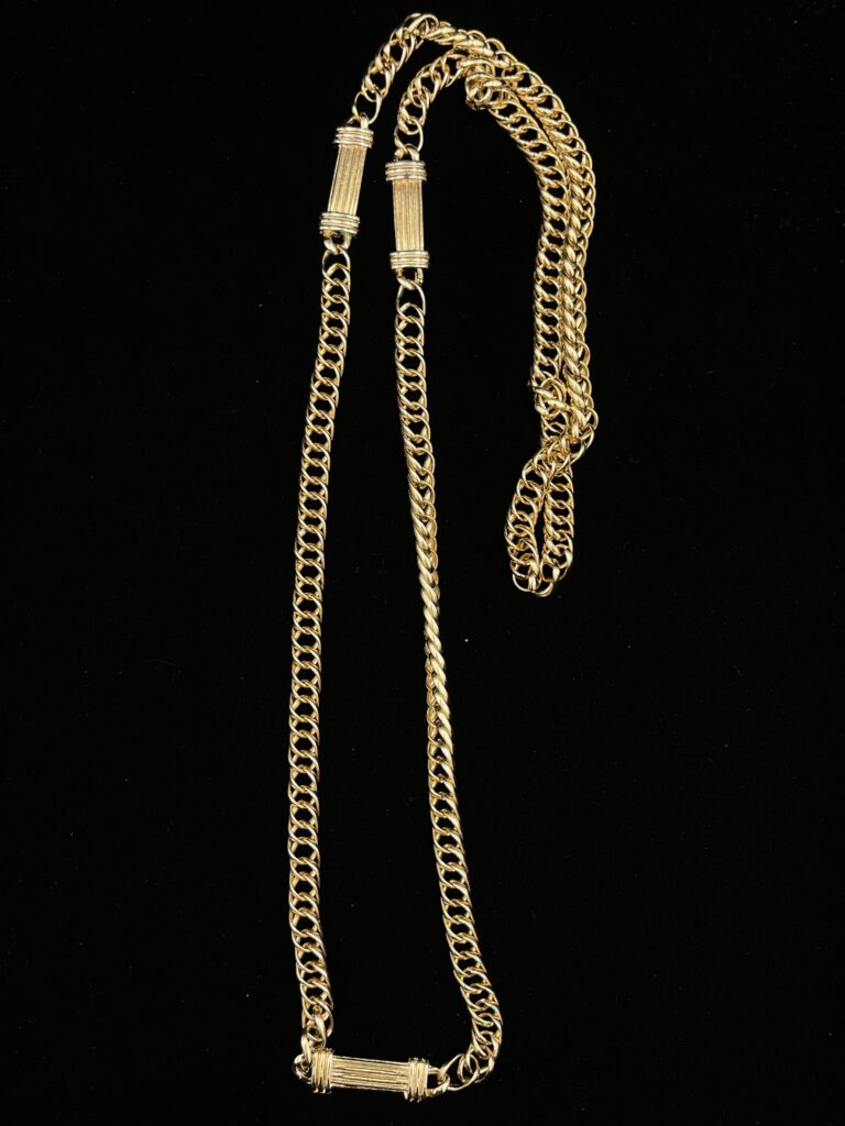 Diese elegante Vintage-Kette in Goldoptik überzeugt durch ihr klassisches Kettendesign in Kombination mit stilvollen, dekorativen Zwischenelementen. Die harmonische Gestaltung verleiht ihr eine edle Ausstrahlung und macht sie zu einem vielseitig kombinierbaren Accessoire. Ein zeitloses Schmuckstück, das jedem Outfit eine stilvolle und raffinierte Note verleiht.