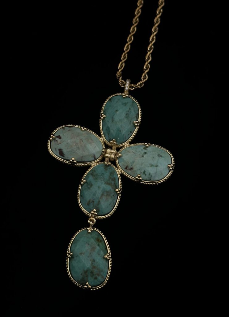 Diese ausdrucksstarke, goldfarbene Kette wird von einem großen, türkisfarbenen Kreuz als Anhänger geziert. Der lebendige Farbkontrast verleiht dem Schmuckstück eine besondere Strahlkraft und macht es zu einem echten Blickfang. Ein stilvolles Accessoire mit ausdrucksstarkem Charakter – perfekt, um jedem Outfit eine individuelle Note zu verleihen.