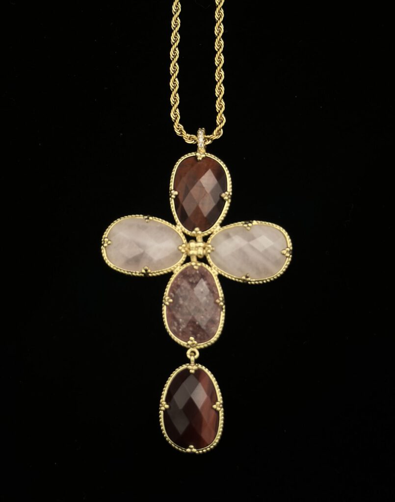 Diese elegante, goldfarbene Kette besticht durch ihren großen Kreuzanhänger in edlen Weinrot- und Rosétönen. Die harmonische Farbkombination verleiht dem Schmuckstück eine warme, luxuriöse Ausstrahlung und macht es zu einem stilvollen Blickfang. Ein ausdrucksstarkes Accessoire, das jedem Outfit eine besondere, feminine Note verleiht.