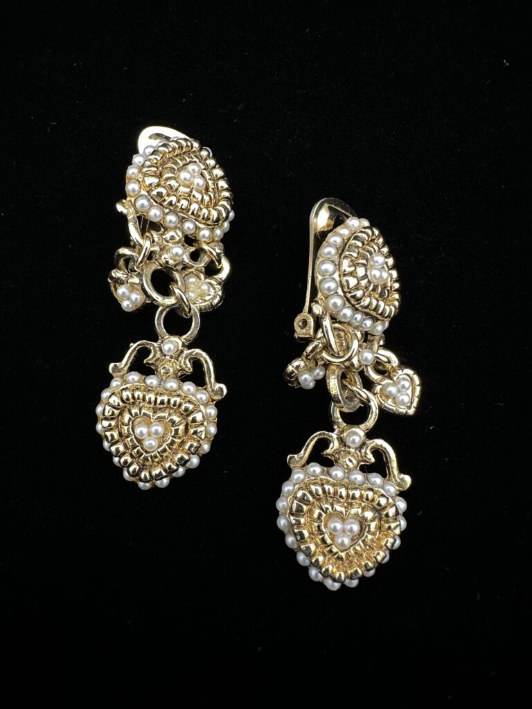 Bezaubernde Ohr-Clips im Vintage-Stil: Zwei filigrane Herzen, verziert mit zarten Perlchen und goldenen Kügelchen, machen dieses Schmuckstück zu einem romantischen Blickfang voller Eleganz.