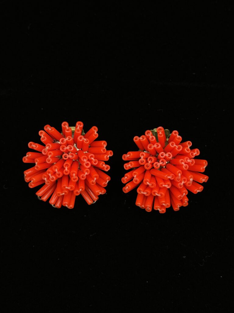 Diese auffälligen Vintage-Ohrclips aus den 1950er Jahren begeistern durch ihr markantes, strahlenförmiges Design in kräftigem Rot. Die besondere Formgebung verleiht ihnen eine ausdrucksstarke und stilvolle Ausstrahlung. Ein außergewöhnliches Accessoire, das jedem Outfit einen lebendigen und eleganten Akzent verleiht.