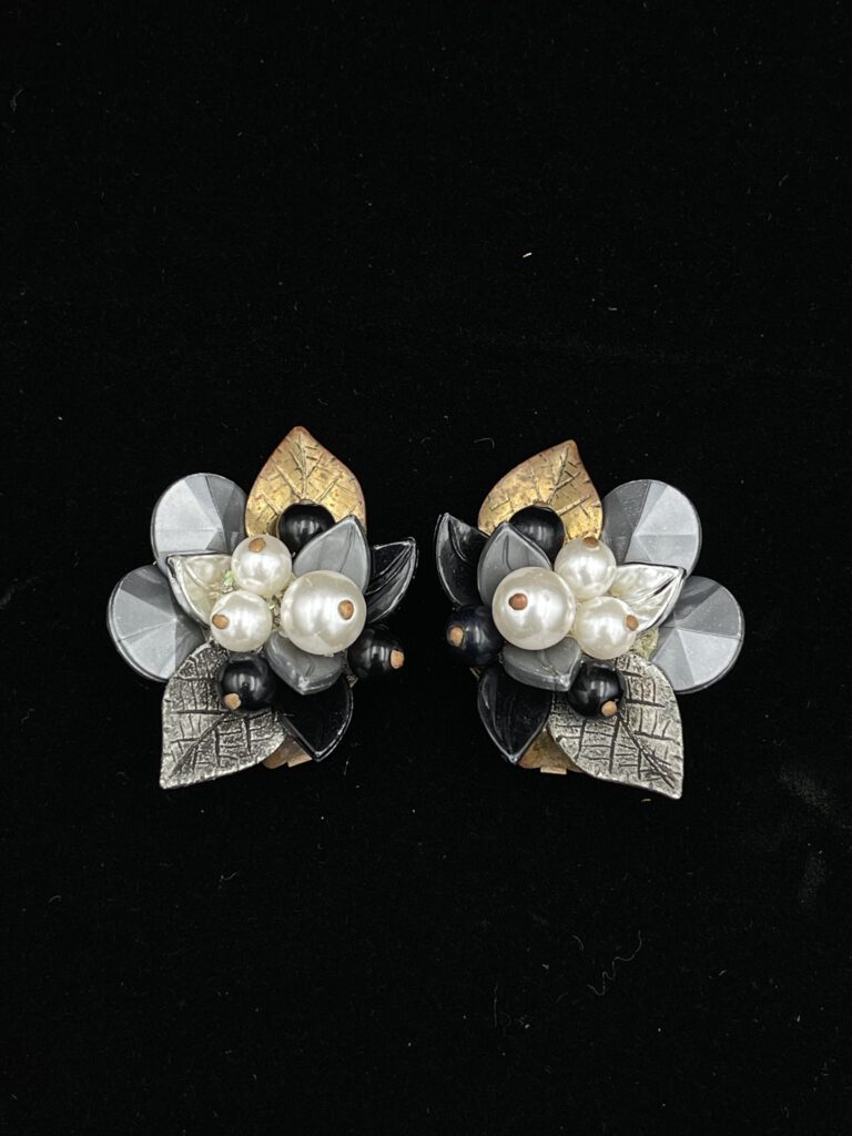 Diese eleganten Vintage-Ohrclips aus den 1950er Jahren bestechen durch ihr detailreiches Design mit Perlen und stilisierten Blättern. Die harmonische Kombination aus verschiedenen Materialien verleiht ihnen eine besondere Ausstrahlung und macht sie zu einem stilvollen Blickfang. Ein klassisches Accessoire, das jedem Outfit eine edle und zeitlose Note verleiht.