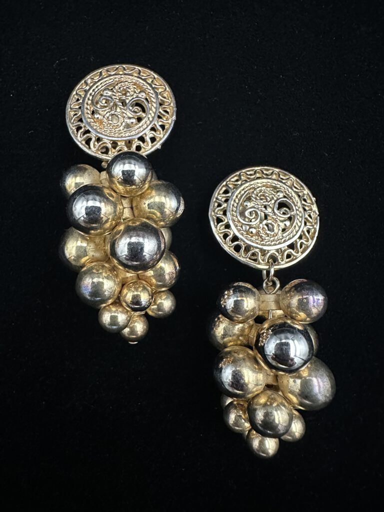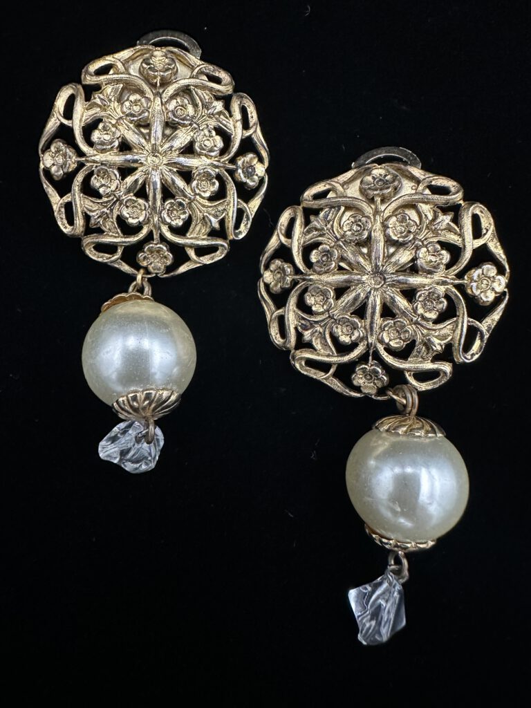 Diese wunderschönen goldfarbenen Vintage-Ohrclips überzeugen durch ihre kunstvolle Verzierung und ihren zeitlosen Charme. Die detailreiche Gestaltung verleiht ihnen eine elegante Ausstrahlung und macht sie zu einem stilvollen Blickfang. Ein besonderes Schmuckstück, das klassische Schönheit mit nostalgischem Charakter verbindet und jedem Outfit eine warme, edle Note schenkt.