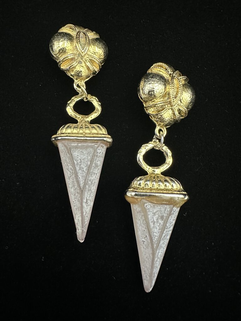 Hier ist eine stimmige Produktbeschreibung im Stil deiner bisherigen Texte: Diese goldfarbenen Vintage-Ohrclips bezaubern mit einem außergewöhnlichen Anhänger in Form eines rosafarbenen Obelisken. Die zart schimmernden Steine verleihen dem Design eine anmutige Eleganz, während die warm glänzende Fassung den charmanten Retro-Charakter unterstreicht. Ein besonderes Schmuckstück, das jedem Outfit eine poetische, leicht verspielte Note verleiht – […]