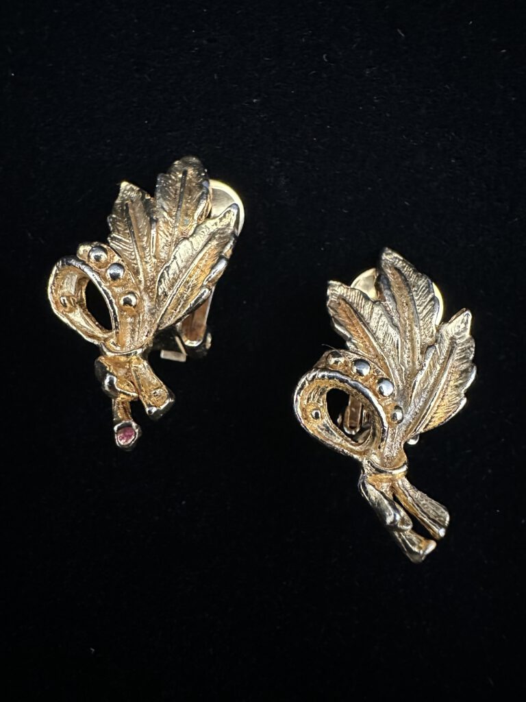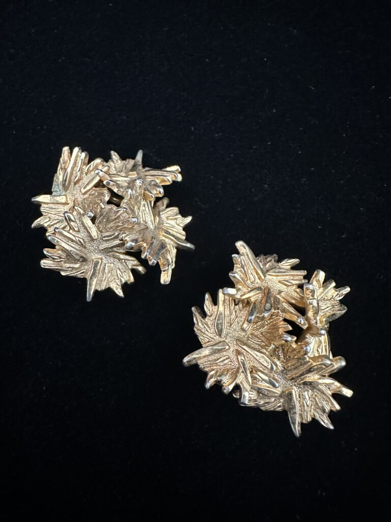 Diese goldfarbenen Vintage-Ohrclips sind in Form eines kleinen Straußes aus feinen Federn gestaltet und kunstvoll verziert. Die filigrane Formgebung verleiht ihnen eine leichte, fast schwebende Ausstrahlung und bringt eleganten Vintage-Charme zum Ausdruck. Ein besonderes Schmuckstück, das Natürlichkeit und Stil verbindet und jedem Look eine sanfte, individuelle Note verleiht.
