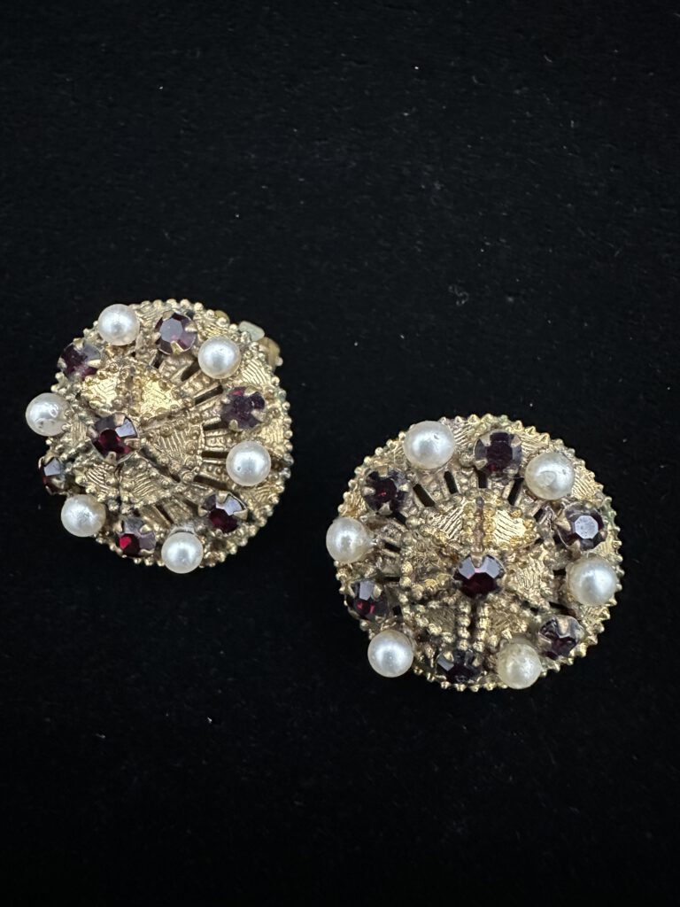 Diese goldfarbenen Vintage-Ohrclips sind kunstvoll verziert und verbinden klassische Eleganz mit liebevollen Details. Kleine rote Steinchen setzen lebendige Akzente und werden harmonisch durch zarte Perlen ergänzt. Ein charaktervolles Schmuckstück mit nostalgischem Charme, das besondere Momente stilvoll unterstreicht und deinem Look eine warme, feminine Note verleiht.
