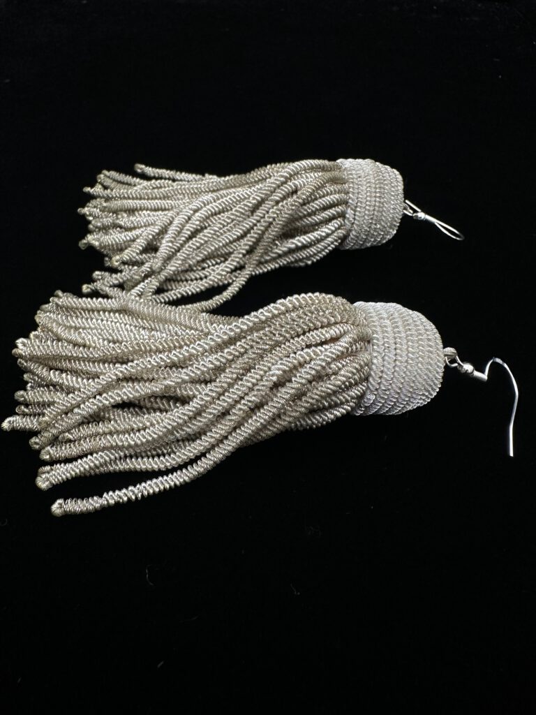 Diese einzigartigen, weißgoldfarbenen Ohrringe bestehen aus einer großen Quaste, die aus einem alten französischen Schloss stammt und liebevoll zu einem einzigartigen Schmuckstücken verarbeitet wurde. Sie vereinen Geschichte, Handwerkskunst und eleganten Charme – ein besonderes Accessoire mit Seele.