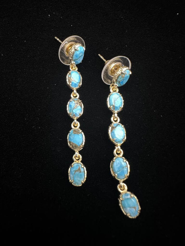 Diese zarten Ohrringe bestehen aus kleinen, aneinandergereihten Türkisen, die bei jeder Bewegung sanft mitschwingen und ein natürliches, lebendiges Funkeln erzeugen. Leicht, verspielt und dennoch stilvoll – ein perfektes Accessoire für alle, die ihre Verbundenheit zur Natur mit einem Hauch von Eleganz zeigen möchten.