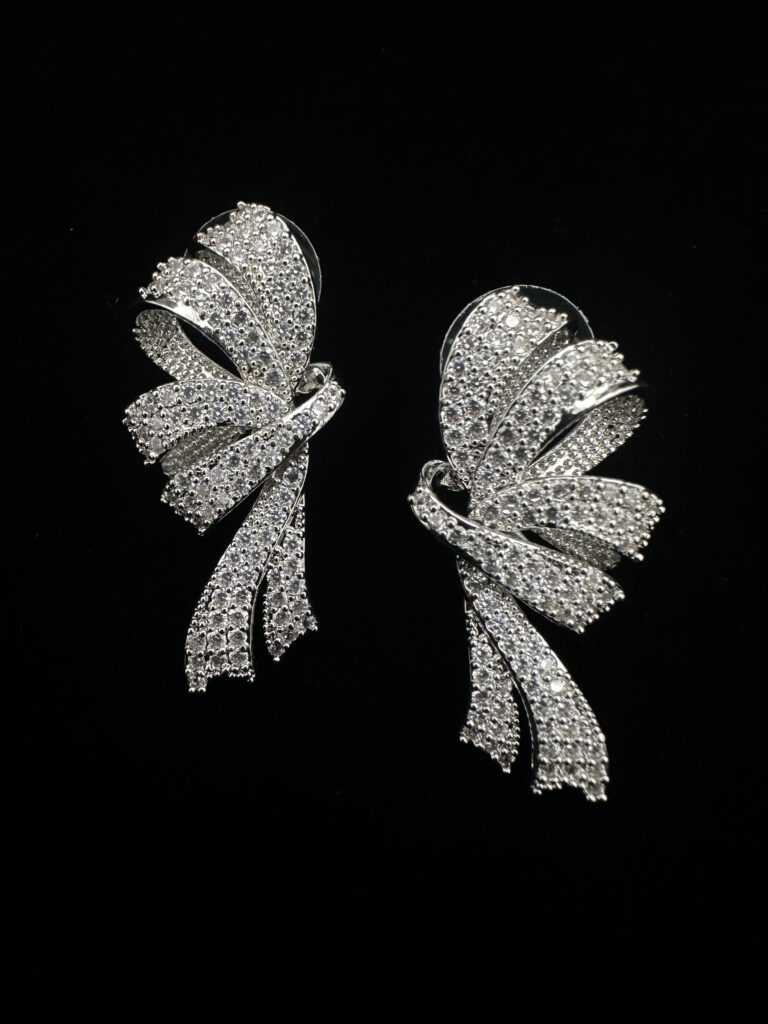 Diese feinen Ohrringe bezaubern mit einer filigranen Schleife, die vollständig mit funkelnden Strasssteinen besetzt ist. Das zarte Design spielt mit Licht und Bewegung und verleiht jedem Look eine edle, feminine Note. Perfekt für alle, die subtile Eleganz und ein Hauch von Glamour lieben.