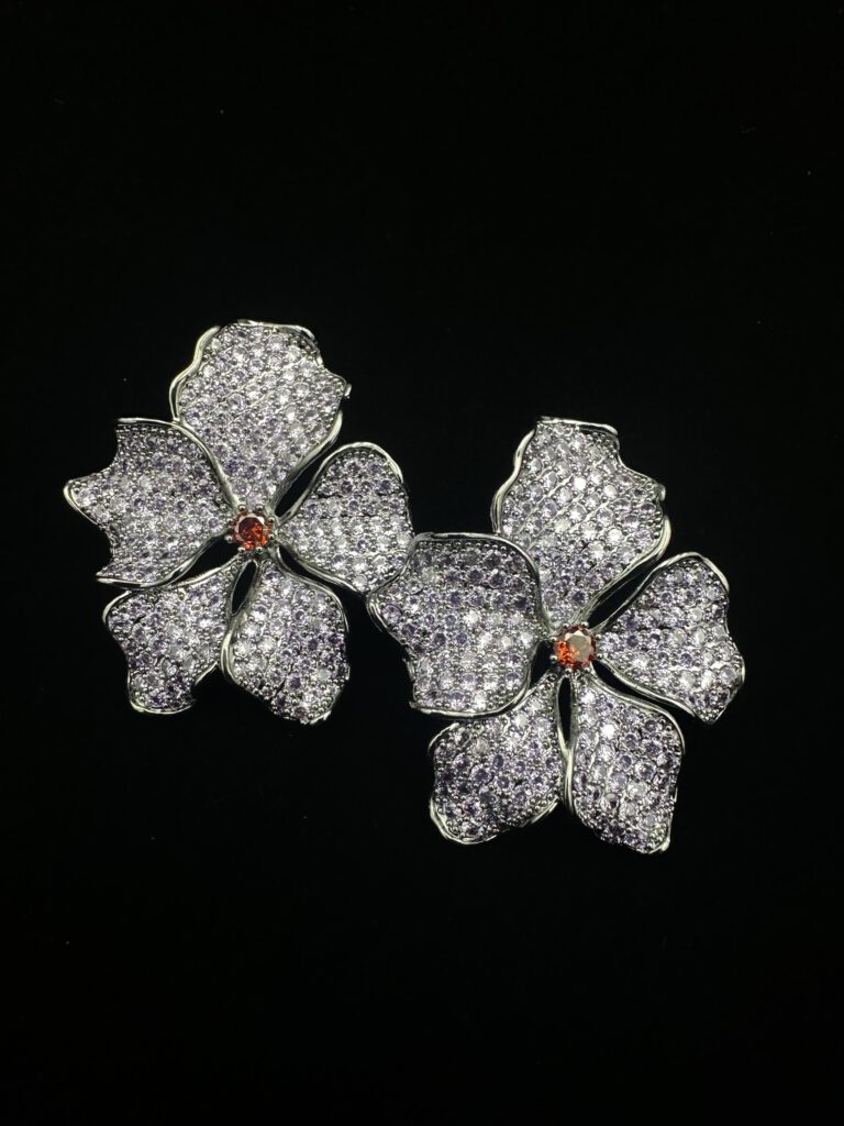 Diese zauberhaften Ohrringe präsentieren eine große Blüte in zartem Flieder, kunstvoll eingefasst in silberfarbene Elemente. Funkelnde Strasssteine setzen strahlende Highlights und lassen das florale Design lebendig wirken. Ein poetisches, elegantes Accessoire, das jedem Look eine sanfte, romantische Note verleiht.