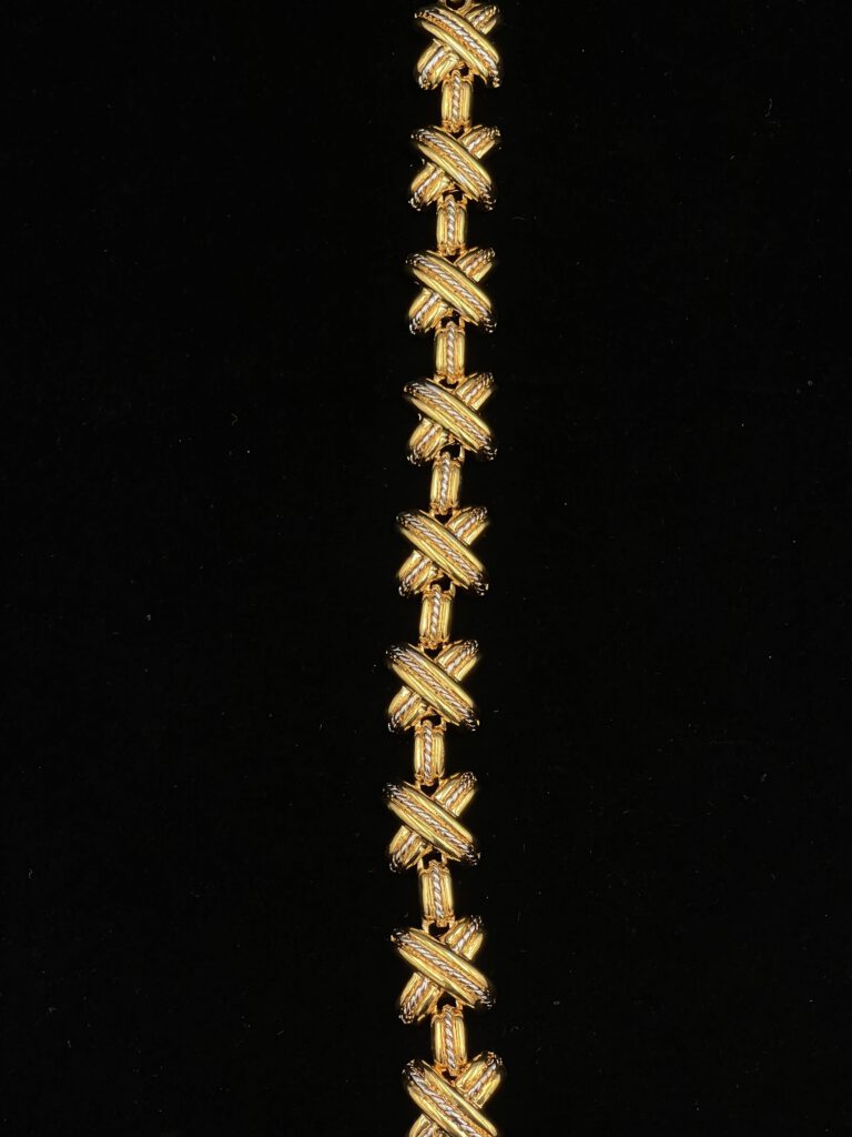 Das Vintage-Armband überzeugt mit seinem goldfarbenen Design und feinen silbernen Akzenten. Die kreuzweise strukturierte Gestaltung verleiht dem Schmuckstück eine besondere Tiefe und eine elegante, lebendige Optik. Ein stilvolles Vintage-Piece, das jedem Outfit eine edle und individuelle Note verleiht.