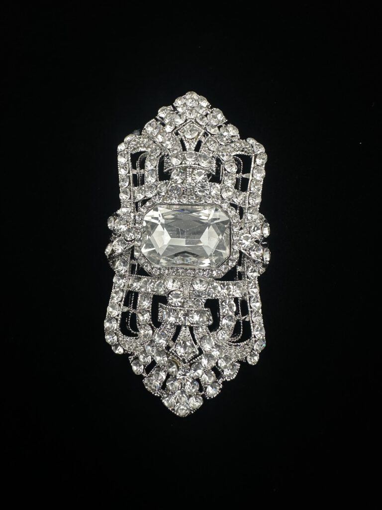 Diese elegante, silbern glänzende Strassbrosche vereint klare Linien und geometrische Formen im typischen Art-Déco-Stil. Funkelnde Strasssteine verleihen ihr einen zeitlosen, glamourösen Ausdruck. Ein stilvolles Modeschmuck-Accessoire, das jedem Outfit eine dezente, doch ausdrucksstarke Note verleiht und auch als Anhänger an einer Kette getragen werden kann.